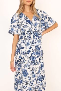 | DETAILS Say hello to spring with this breezy and beautiful midi wrap dress! It features an elegant overlay neckline, short relaxed sleeves, and an attached waist tie closure. Plus, the print – a vibrant blue floral design – is perfect for a day out in the sunshine.