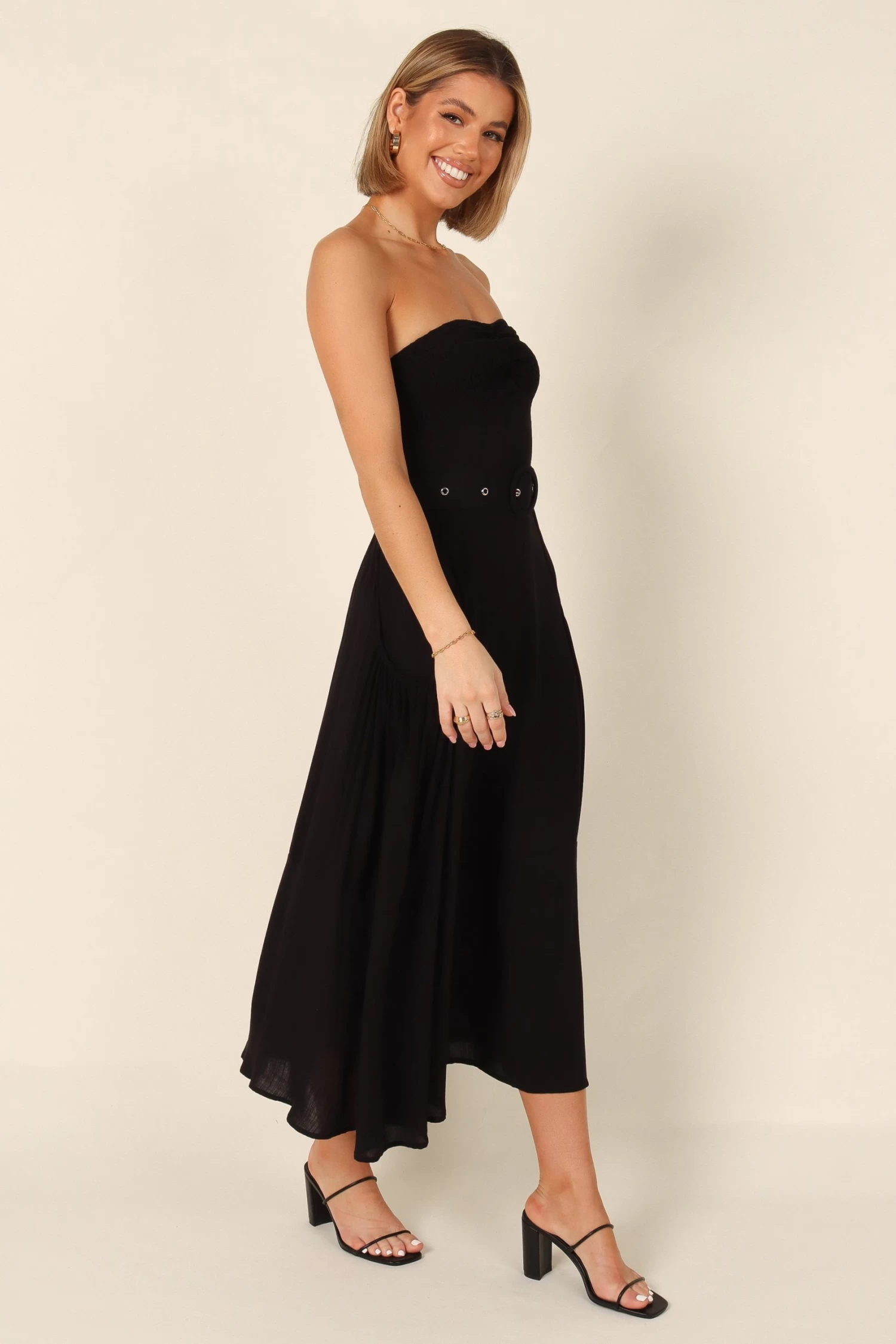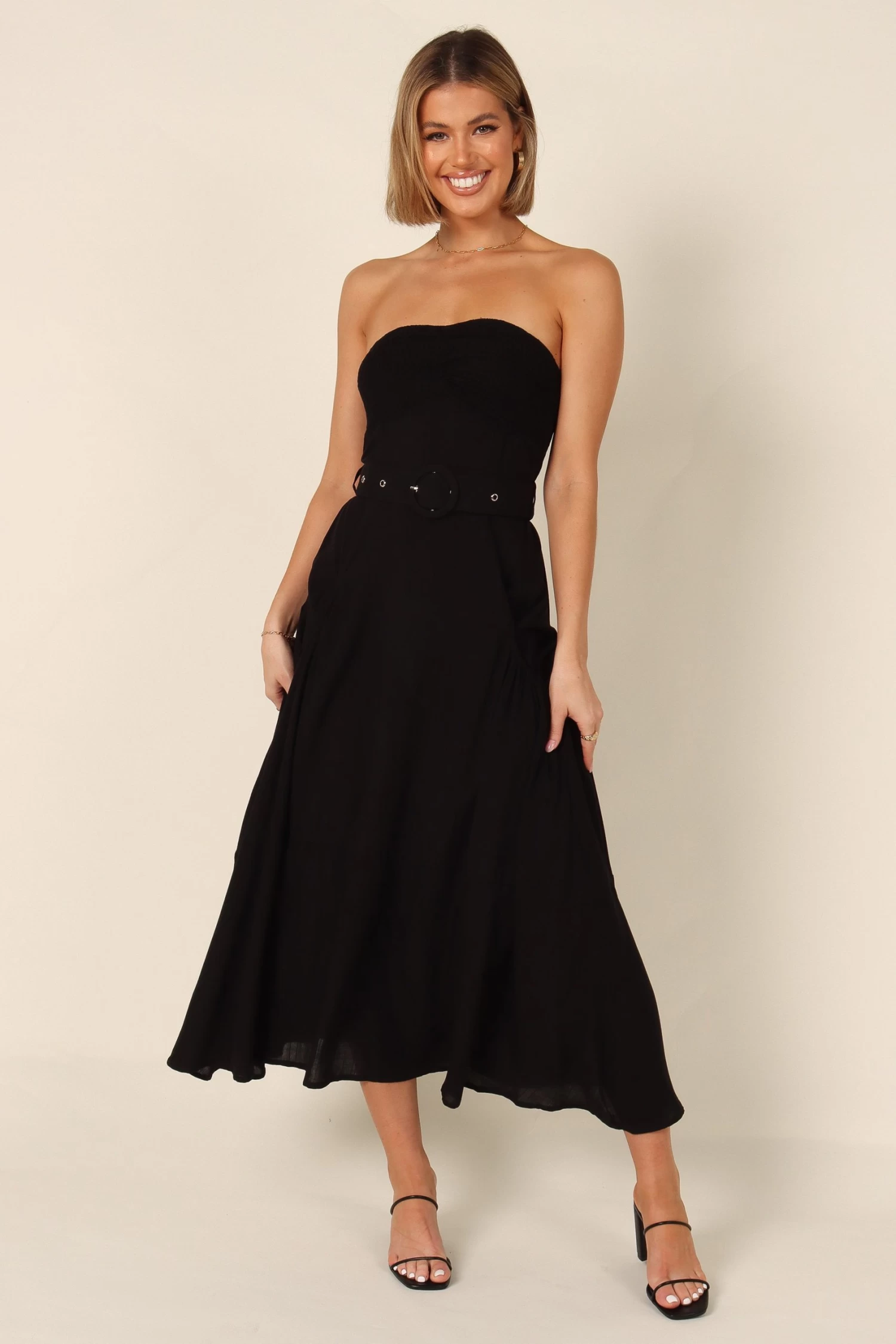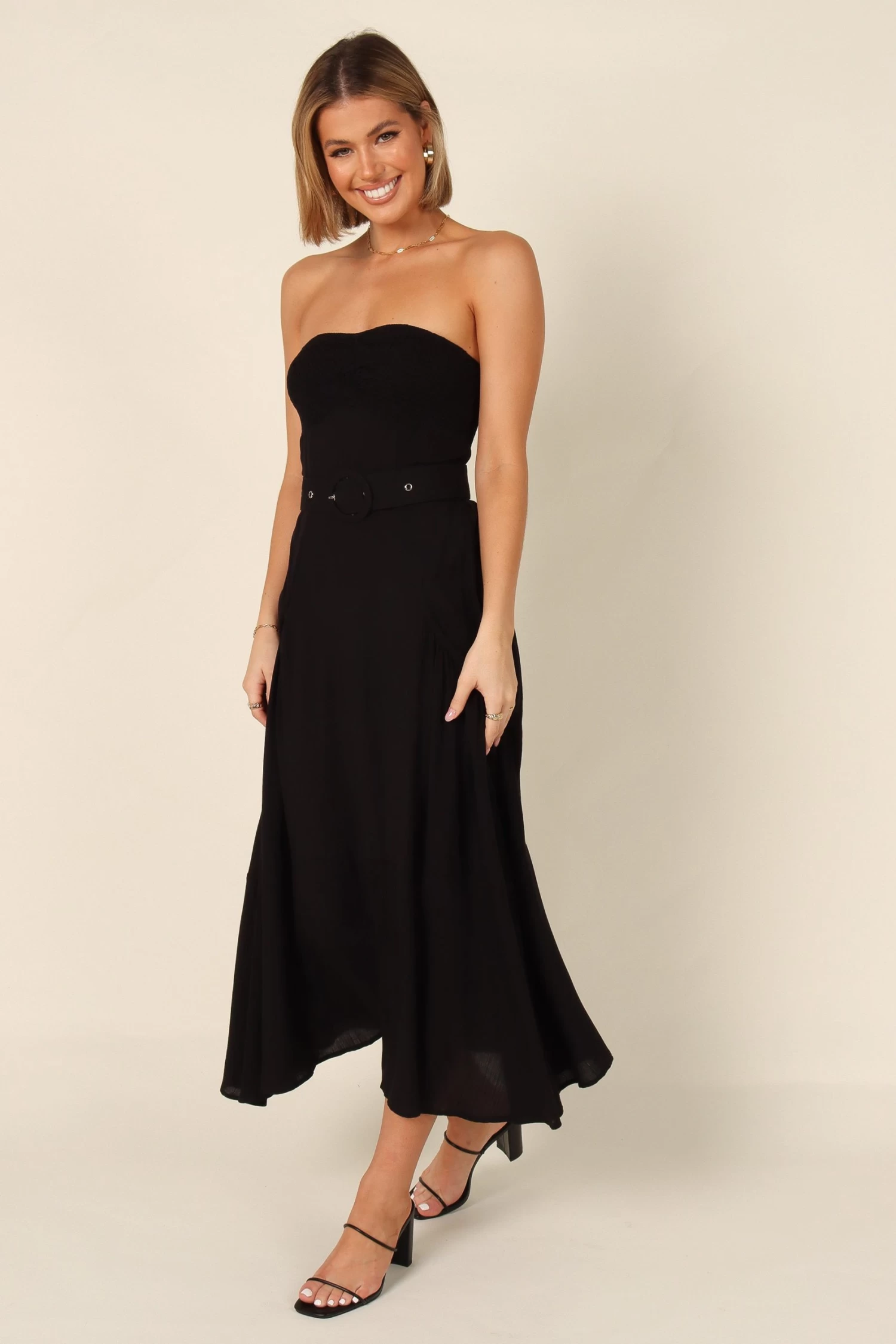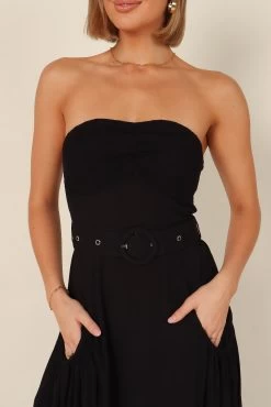 | DETAILS Are you ready for your next party? Look no further than this strapless belted maxi dress! Featuring a shirred bodice and ruched bust detail, this elegant design is perfect for any special occasion.