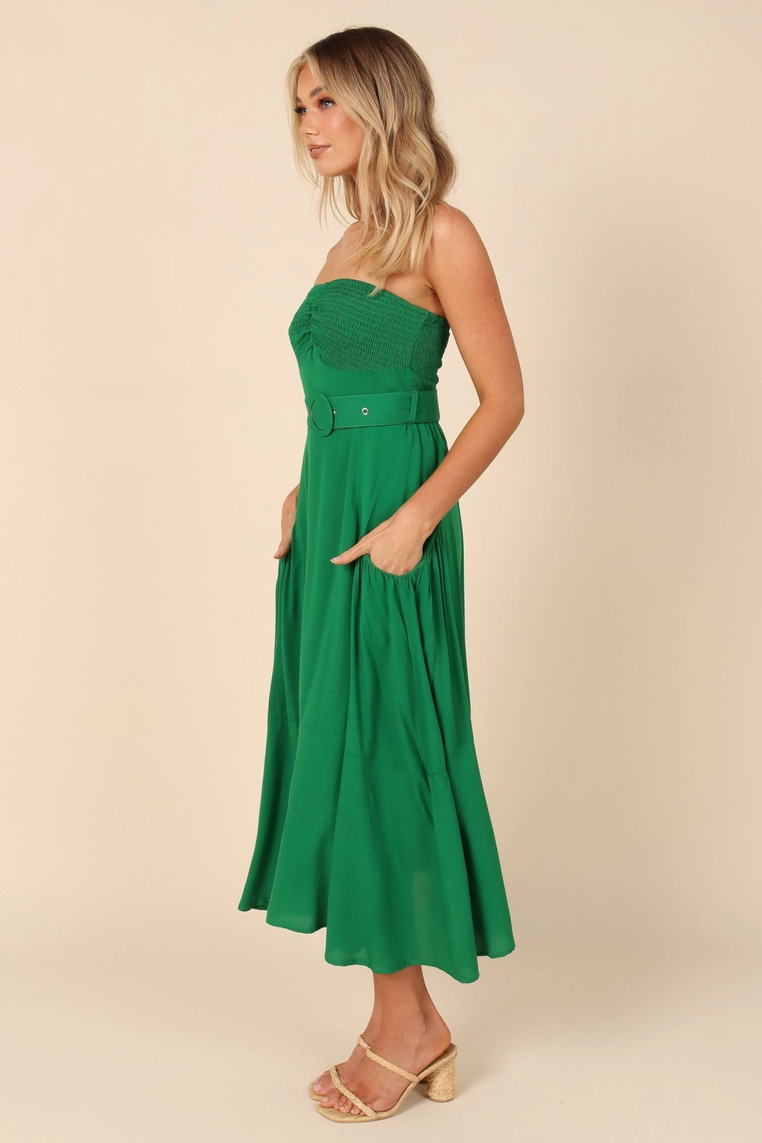 | DETAILS Are you ready for your next party? Look no further than this strapless belted maxi dress! Featuring a shirred bodice and ruched bust detail, this elegant design is perfect for any special occasion.