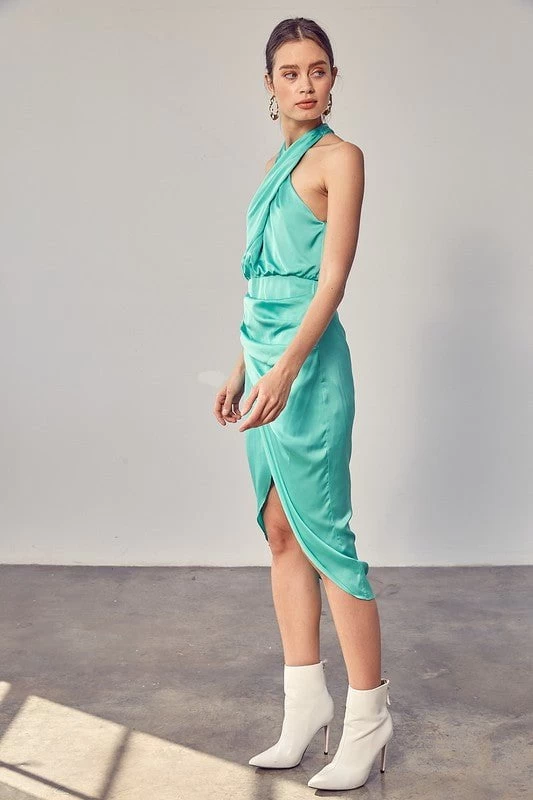 | DETAILS Feel your most feminine in this gorgeous halter style midi dress! Its soft satin feel and unique front cross over halter neckline with button close make it a must-have for any special occasion.