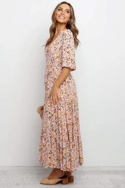 | DETAILS Step out in style wearing this maxi length dress! Featuring a v neckline and mid length sleeves with elasticised cuffs, it’s sure to flatter your figure. Functional buttons adorn the bodice, whilst being gathered at the waist with a tie detail for a fun take on femininity. Due to the relaxed fit of this dress, it is recommended if you are between sizes to select a size down.Â