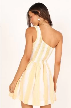 | DETAILS Dress to impress in this cute and flirty one shoulder mini dress. With its shirred bodice and drop a-line skirt design, you’re sure to turn heads with its eye-catching yellow stripe print. Whether you’re headed out for date night, or meeting up with friends, this look is perfect for any occasion!