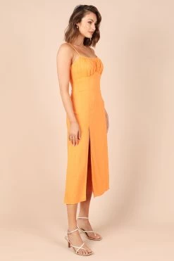 | DETAILS This party-ready midi dress is a perfect pick for any special occasion! Its bright hue, round neckline and thin adjustable straps will have you feeling like the bell of the ball. The gathered detail on the bust gives an extra touch of femininity, while a back invisible zip with hook and eye clasp ensures a secure fit.