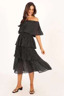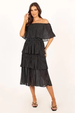| DETAILS Dress up in style with our cute off shoulder midi dress! Featuring a straight elasticised neckline, short relaxed sleeves and a tiered plisse ruffle design, this polka dot printed dress is sure to make heads turn. The midi length adds an extra touch of femininity that will have you looking and feeling beautiful all day long!