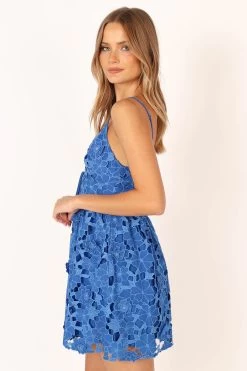 | DETAILS This blue mini dress is the piece you need for your next party look. With a v neckline, bust tie detail and thin adjustable straps, it’s perfect for showing off your figure while still being comfortable.