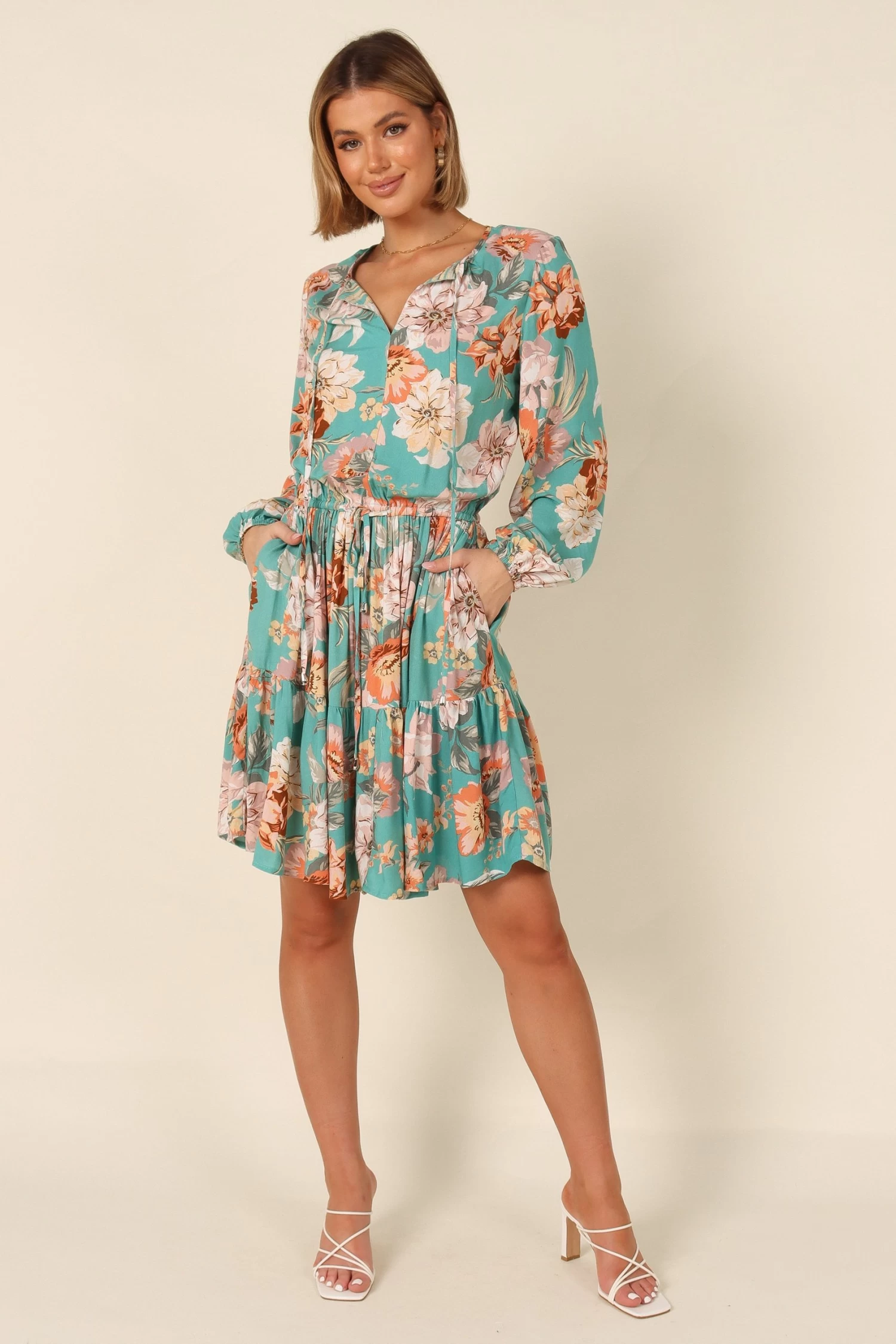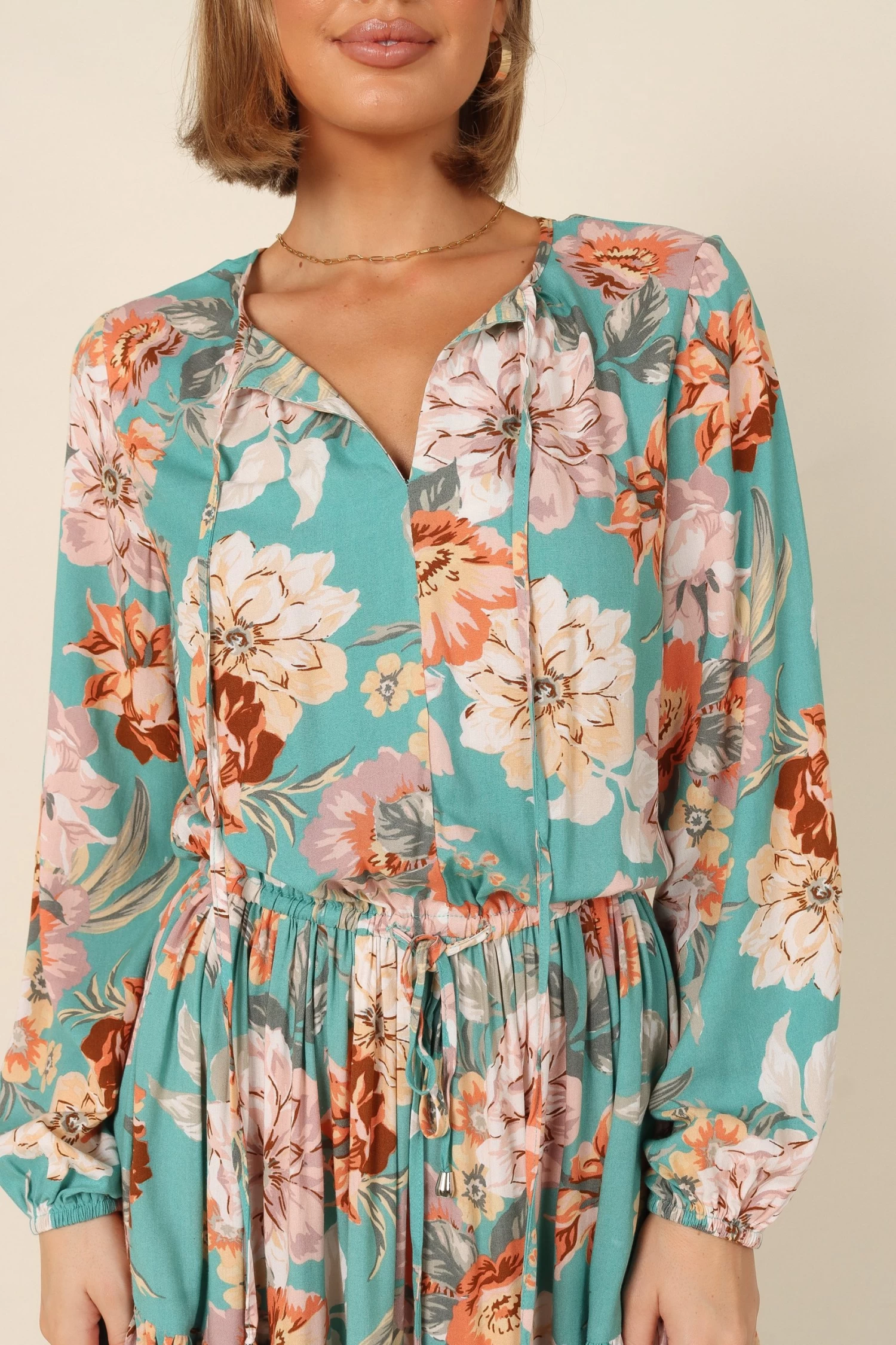 | DETAILS Be ready to take on the season with a flirty and fun addition to your wardrobe! This above the knee length dress is sure to turn heads with its unique cut out detail, tie close and beautiful large floral print.