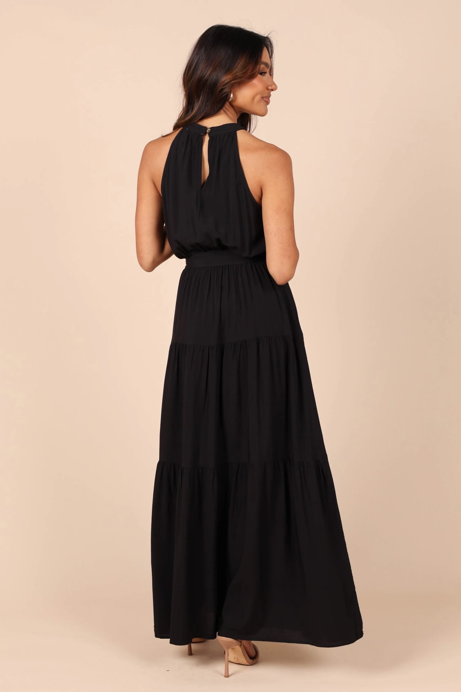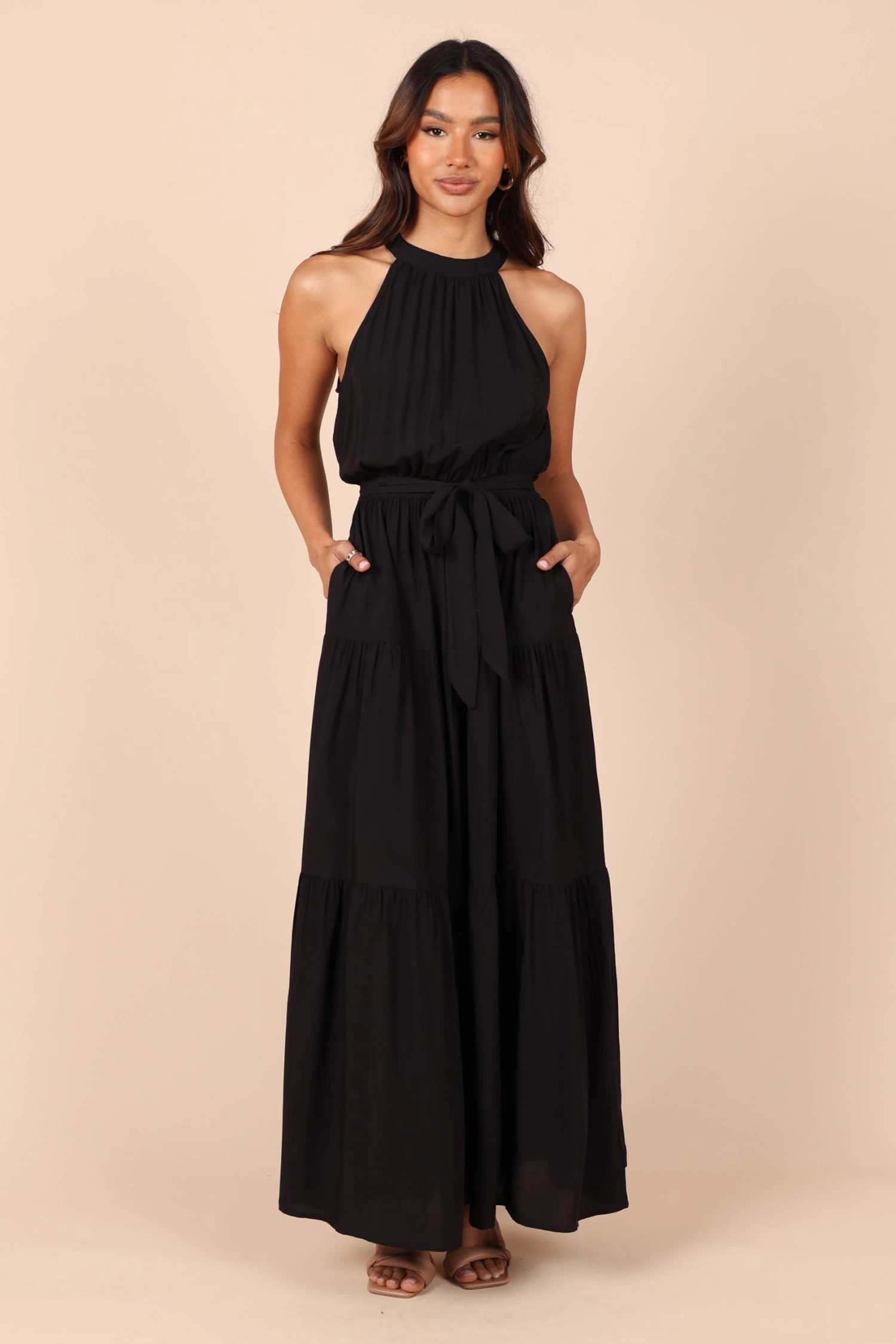 | DETAILS This halter neck maxi length dress is perfect for any occasion, whether it be a party or day out with friends. The halter style has a button close and is complemented by an elasticised waistband, which gives it an elegant silhouette that will flatter your figure.