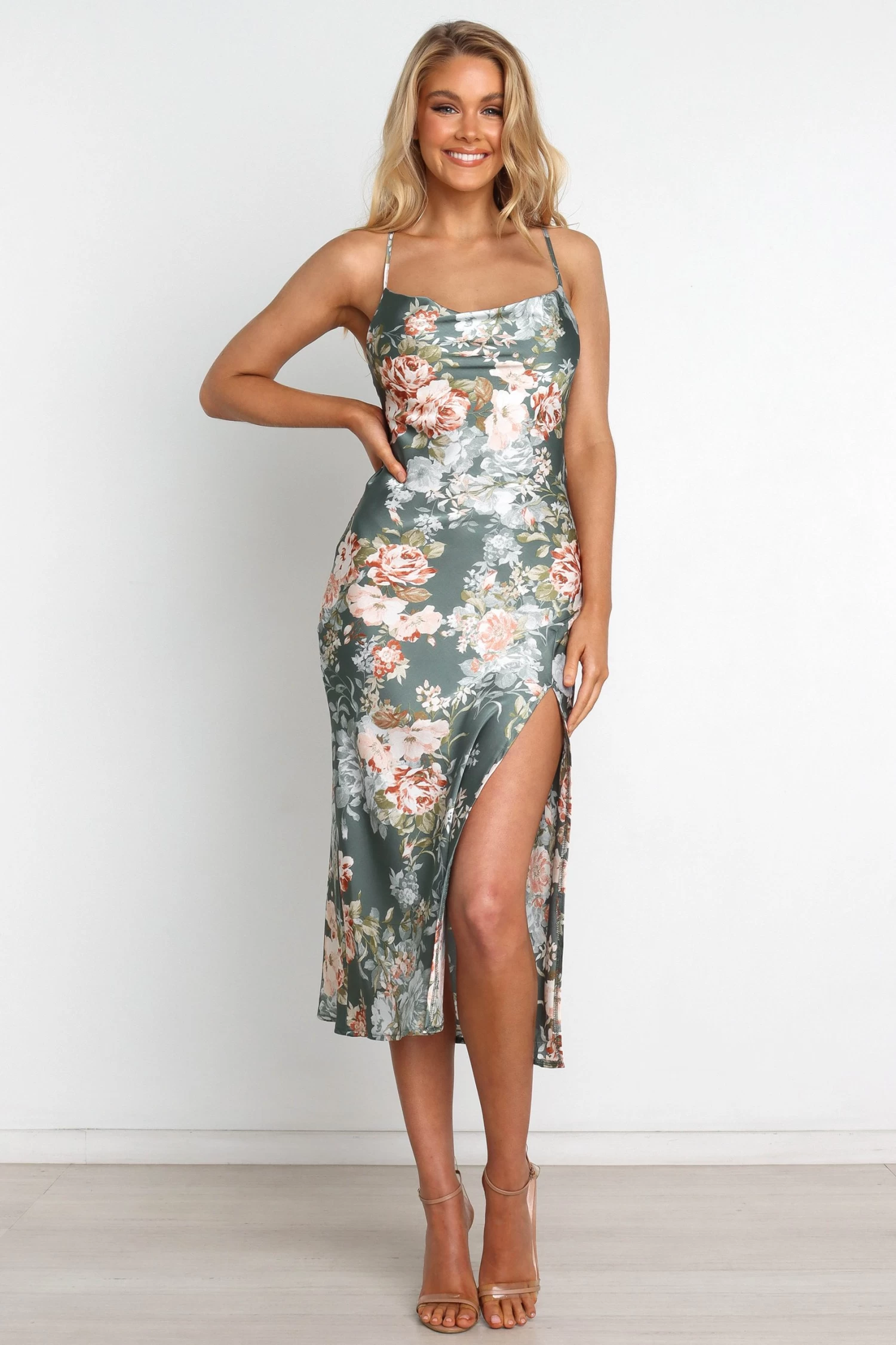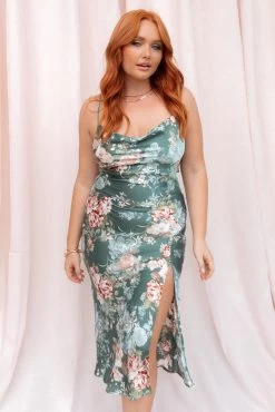 | DETAILS Make a statement for your next special occasion in this stunning midi dress! Featuring a cowl neckline, thin adjustable straps, satin sheen feel, and a beautiful floral print, this dress is sure to turn heads.