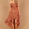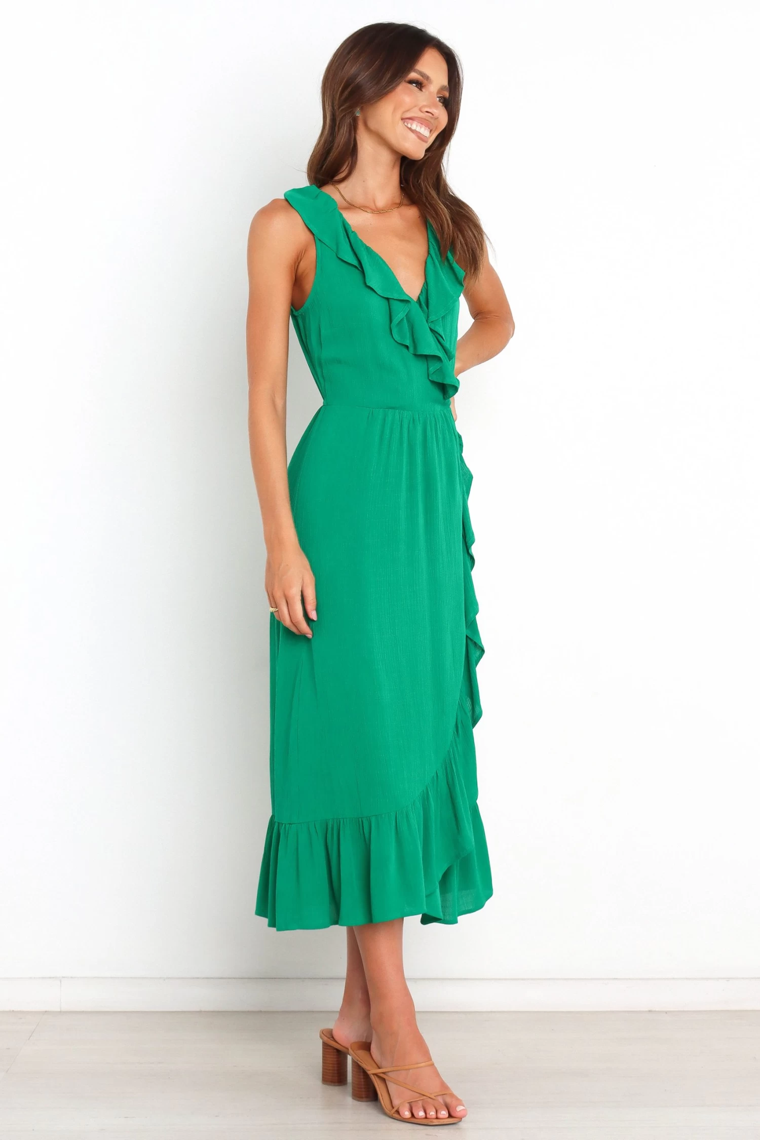 | DETAILS This wrap style dress is sure to give you the flirty feeling of summer with its midi length, v overlay neckline with button close, tie hole on right hip and attached waist tie. The fun doesn’t stop there – it’s detailed with a ruffle for an extra charming touch.