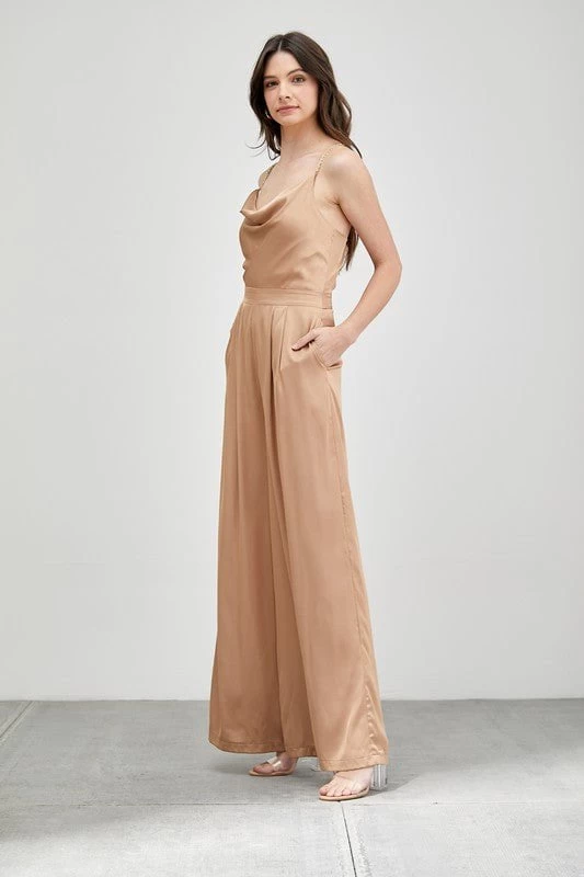| DETAILS These days, it’s all about the wide leg style jumpsuits! This cowl neckline jumpsuit is no exception. With thin shoulder straps, and a back cross-over strap feature, this jumpsuit exudes event wear style that will have you turning heads wherever you go.