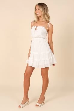 | DETAILS This mini summer dress is the perfect addition to your wardrobe! It features a straight neckline with an adorable tie close detail, adjustable tie straps, an elasticised waistband for extra comfort, and a drop tier design.