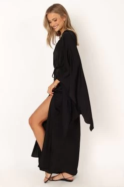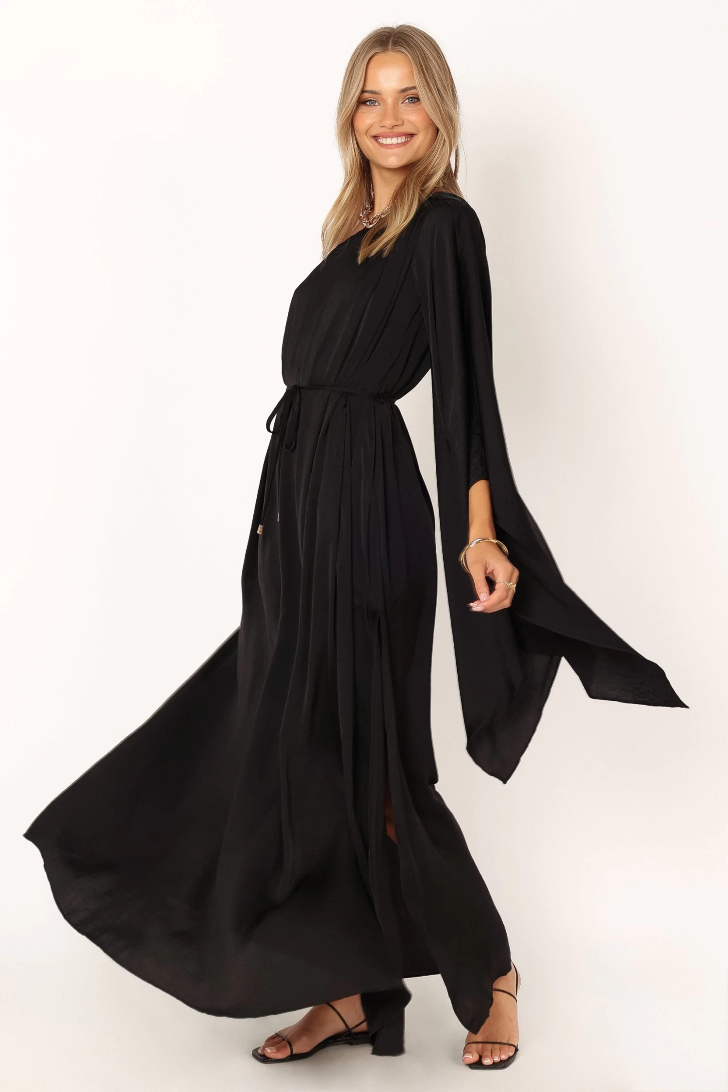 | DETAILS This season, we’re loving the maxi dress trend. Our Maxi Dress is sure to keep you looking stylish at any event. It features an asymmetrical neckline, long flared sleeve and gathered shoulder detail for a beautiful silhouette.