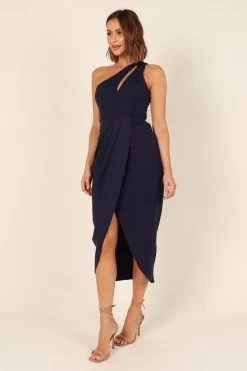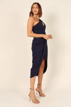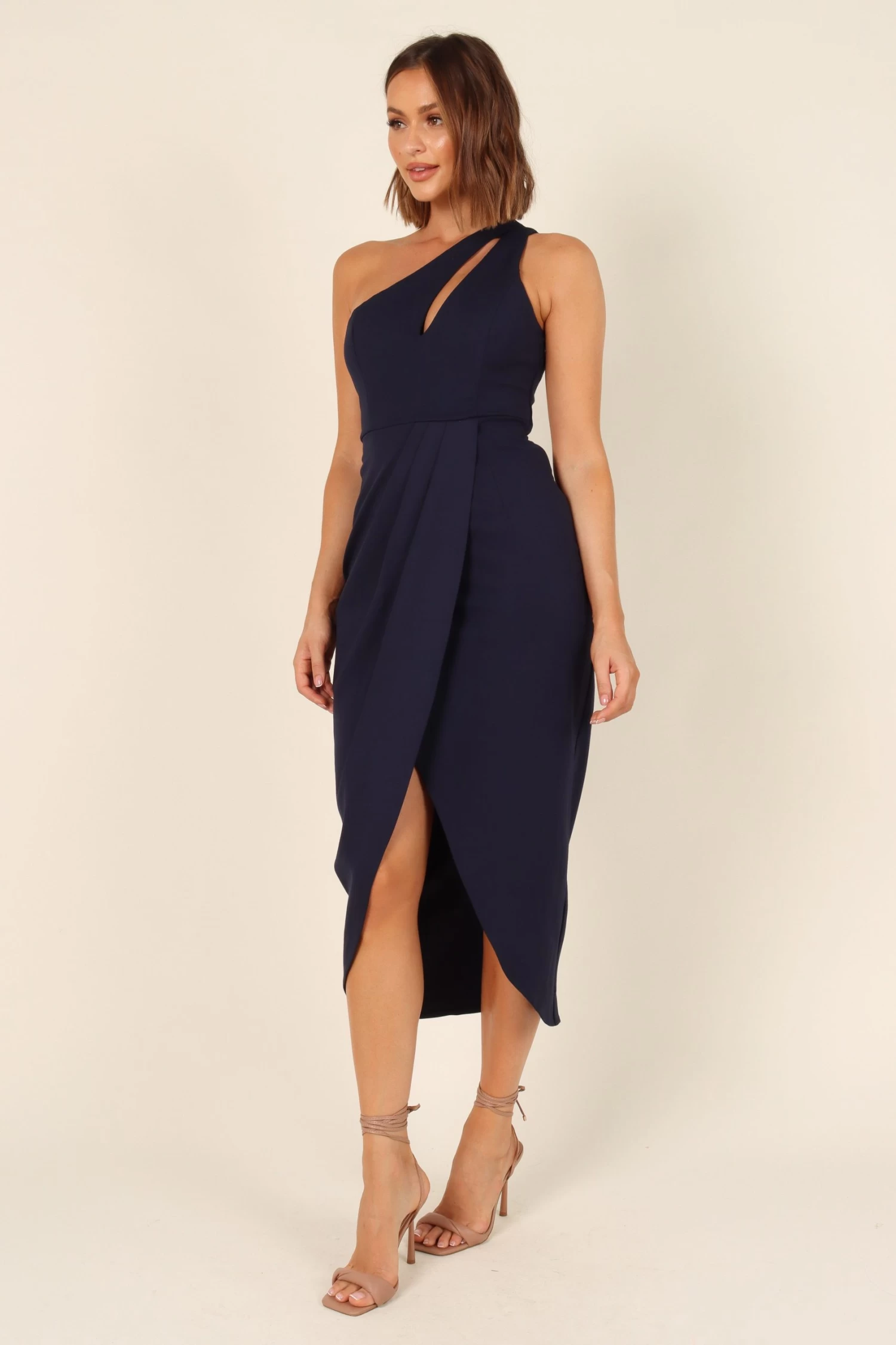 | DETAILS Are you looking for a show-stopping dress? Look no further than this stunning one shoulder midi-length dress! It features an eye-catching front and back cut out detail, as well as structured boning in the bodice to give you a flattering silhouette.