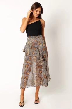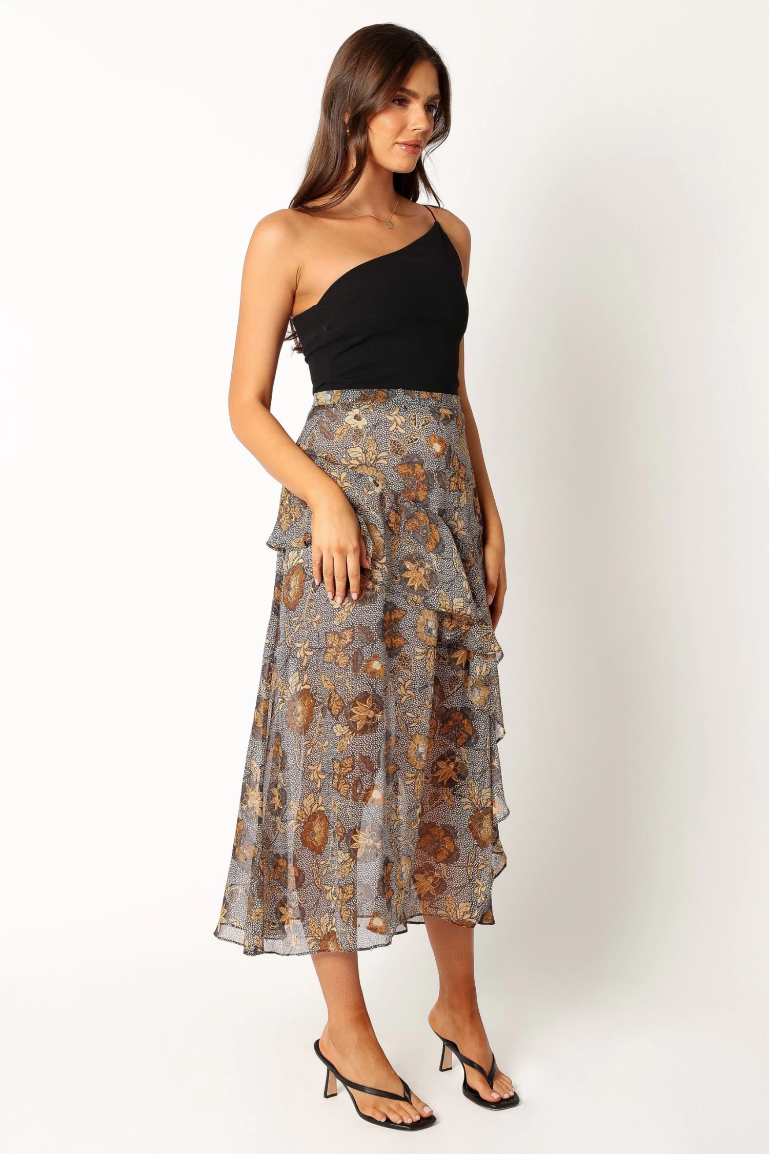 | DETAILS Introducing the new must-have in your wardrobe: a midi skirt with an asymmetrical ruffle overlay feature. This trendy piece boasts a back invisible zip with hook and eye clasp, as well as a back split for extra movement.