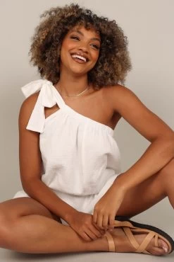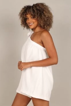 | DETAILS Feel the summer vibes in this fun and flirty playsuit! Featuring an asymmetric elasticised neckline, tie close shoulder strap and relaxed fit, you’ll stay comfortable all day long! Perfect for balmy days spent at the beach or those warm evening strolls in the city.