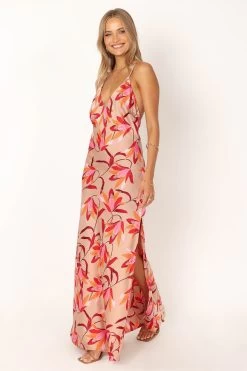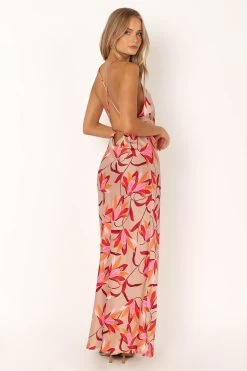 | DETAILS Introducing the perfect event dress: our Maxi Length V Neck Dress in a Floral Print Design. Cut from luxurious soft satin fabric, this piece features thin adjustable straps, a cross back design, belt loops, a detachable waist tie and side splits for added movement.