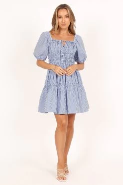 | DETAILS This mini length dress is such a fun addition to your summer wardrobe! With its blue stripe print, you’re sure to turn heads and get lots of compliments. The classic square neckline features a tie close, while the short sleeves have elasticised cuffs for comfort.