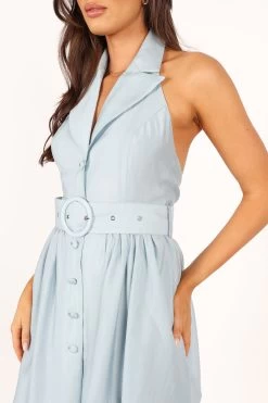 | DETAILS The perfect look for any occasion? Look no further than this cute and fun mini dress! This blue beauty features a peak lapel collar, halter neckline, adjustable belt with loops and functional button down closure at the back.
