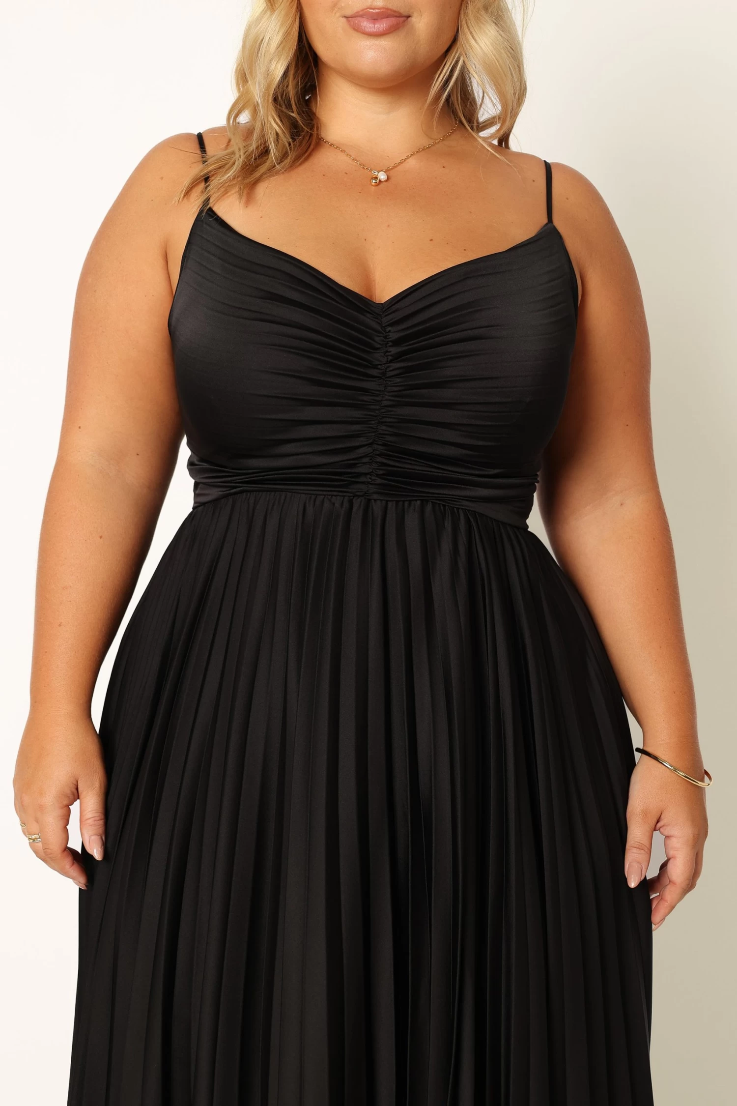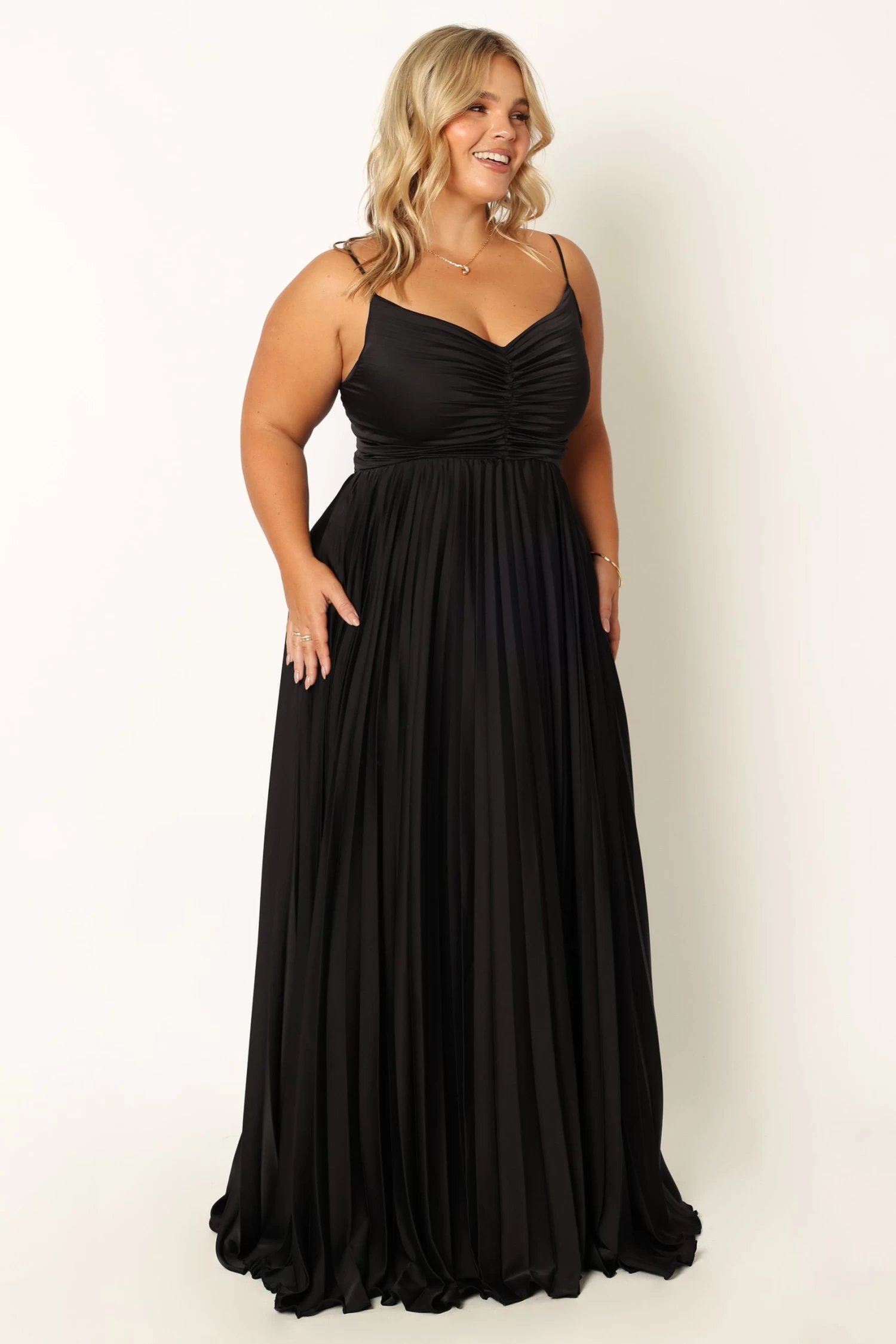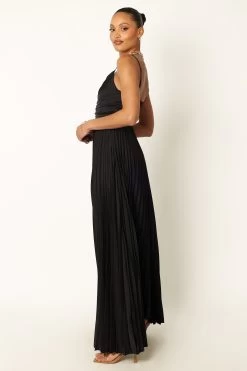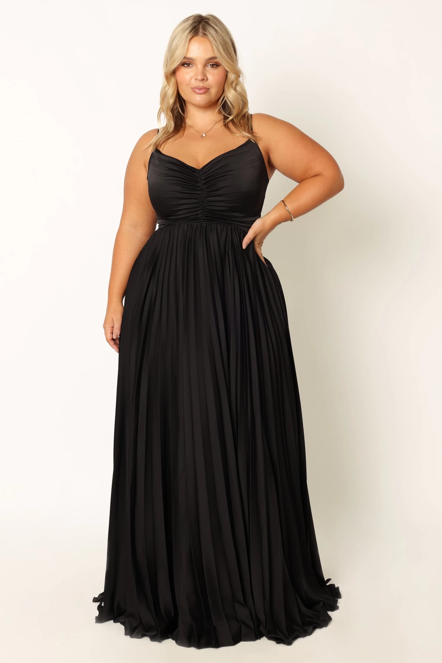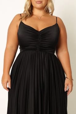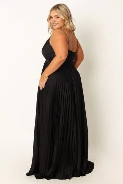 | DETAILS This elegant maxi dress is the perfect choice for any special occasion. It features a v neckline, thin adjustable straps and a back invisible zip with hook and eye clasp for an easy fit. The pleated satin fabric has a soft feel that will make you look and feel fabulous all night long. Make a statement at your next party in this stunning maxi dress!