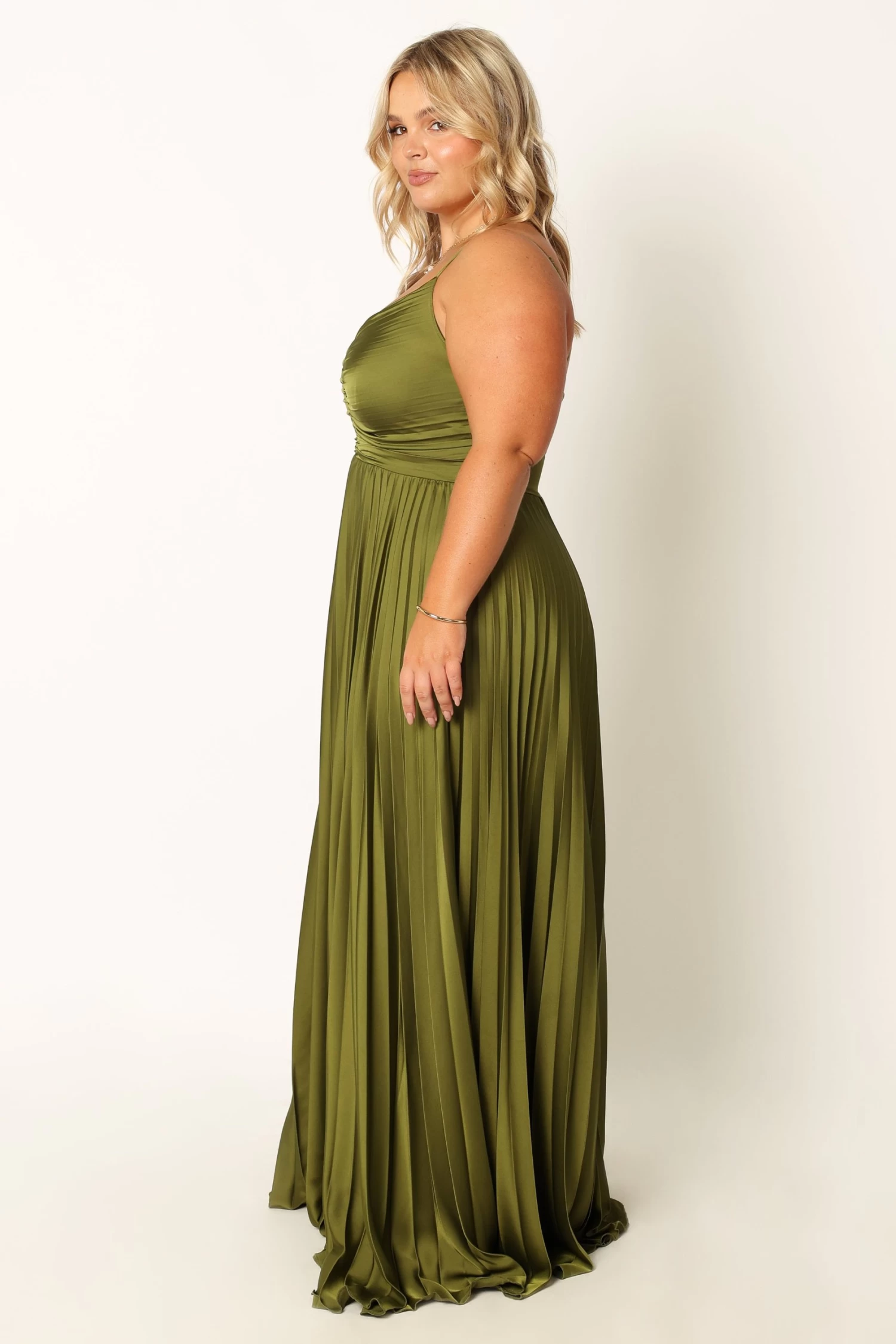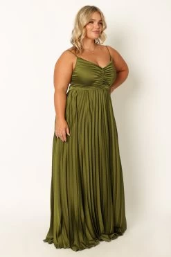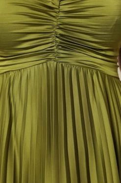 | DETAILS This elegant maxi dress is the perfect choice for any special occasion. It features a v neckline, thin adjustable straps and a back invisible zip with hook and eye clasp for an easy fit. The pleated satin fabric has a soft feel that will make you look and feel fabulous all night long. Make a statement at your next party in this stunning maxi dress!