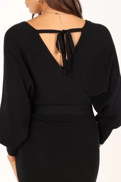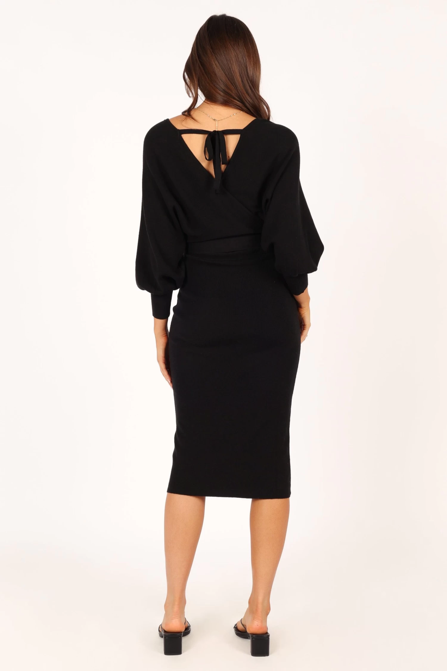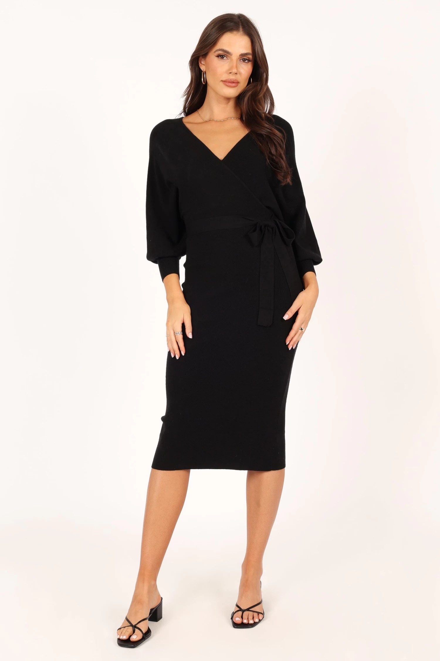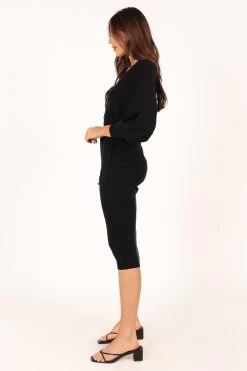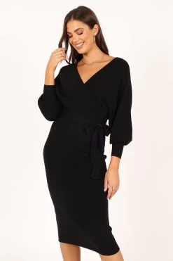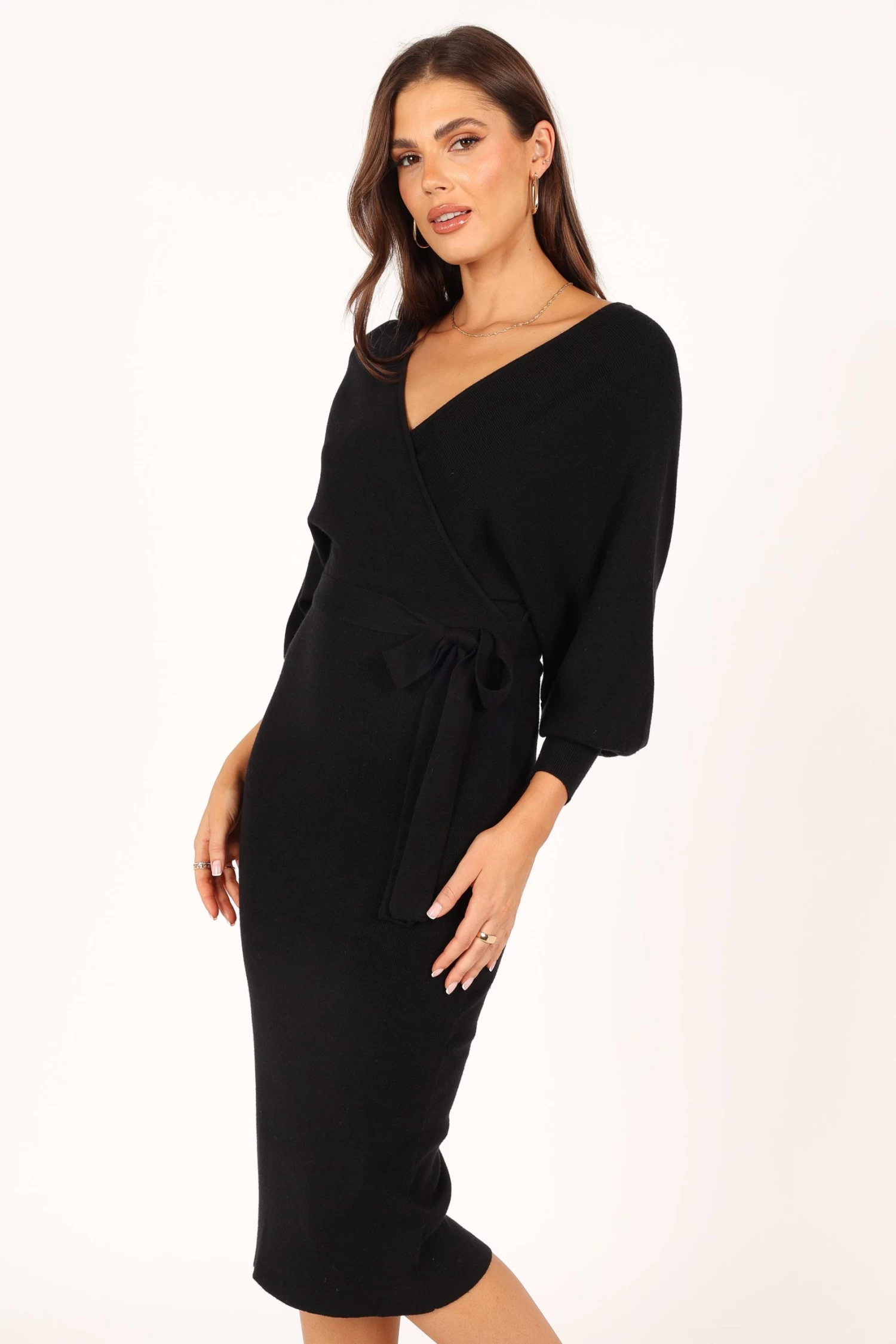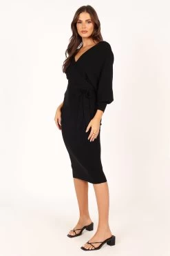 | DETAILS This bodycon knit dress is a must-have for any fashionista’s wardrobe! The midi length and overlay v neckline create an elegant silhouette that’s perfect for any occasion. The wide long sleeve with ribbed cuff adds a touch of flirty fun, while the two tone top feature gives this dress an extra edge.