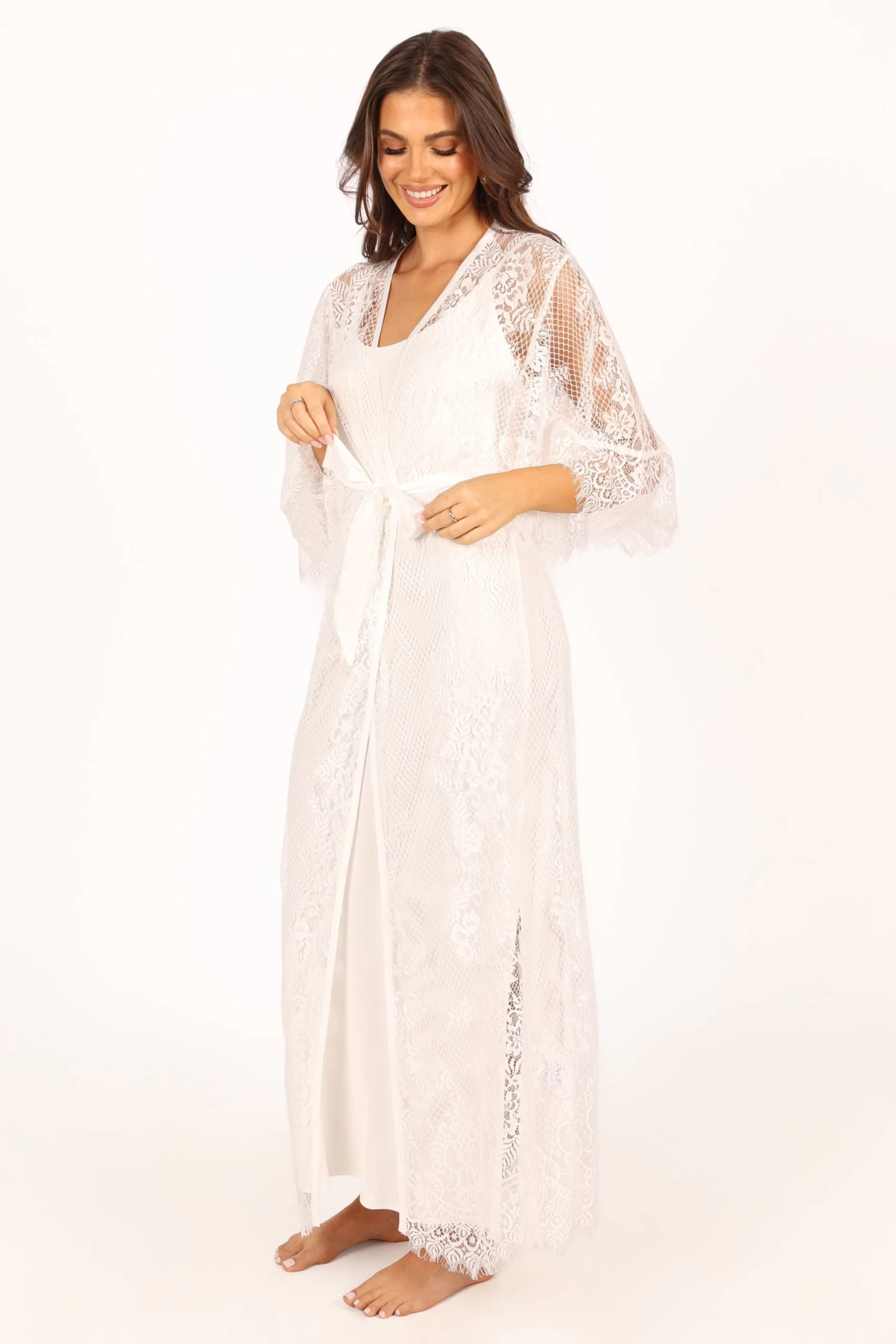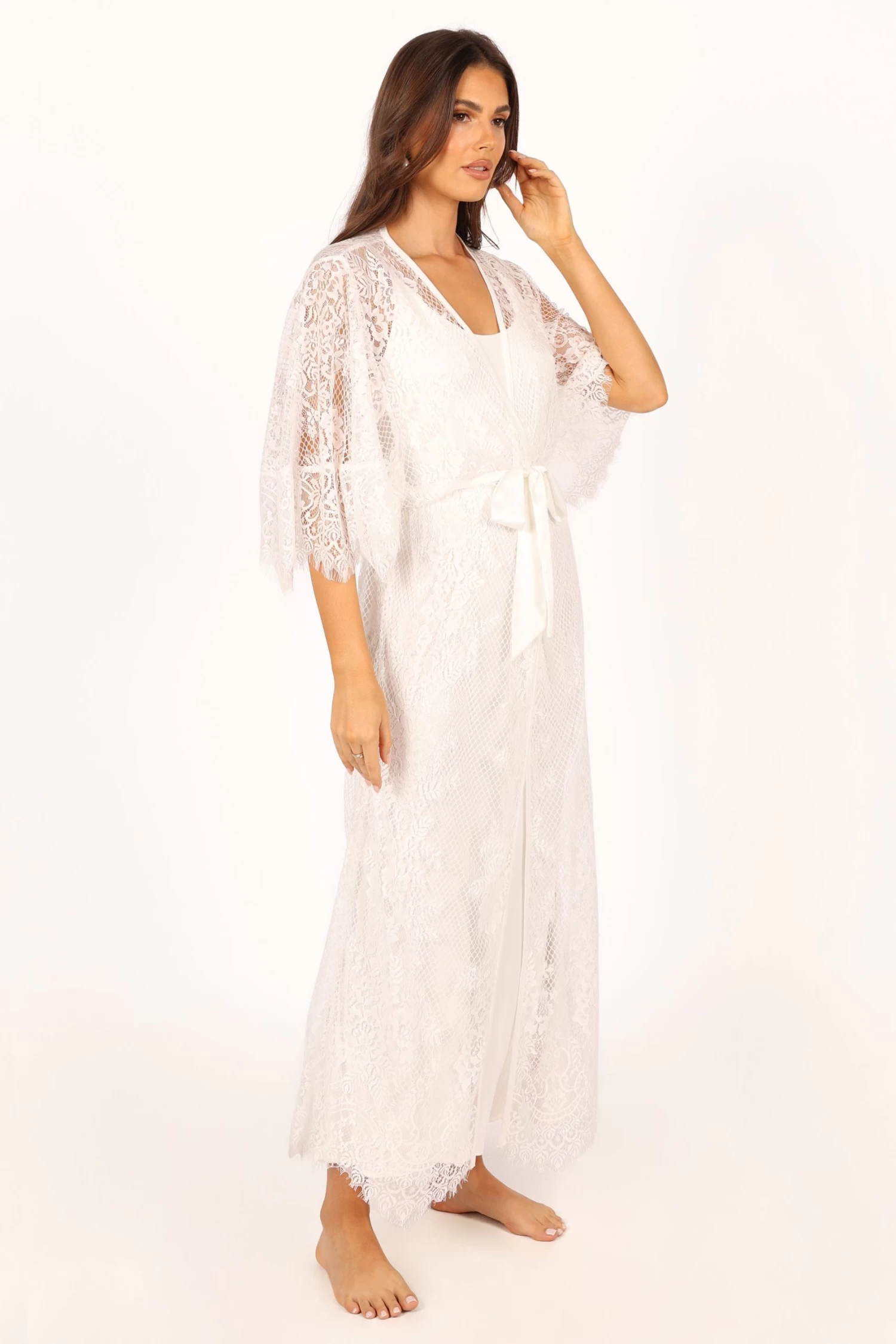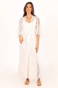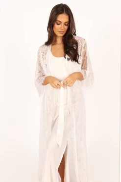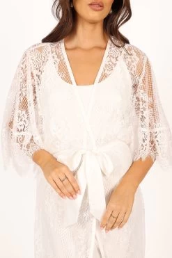 | DETAILS This soft floral lace robe is the perfect addition to your lingerie wardrobe. With a long length style and relaxed sleeves, it’s perfect for those romantic nights in or out on the town. The wrap front design of this luxurious robe ensures a flattering fit, while the detachable waist tie provides extra security and comfort.