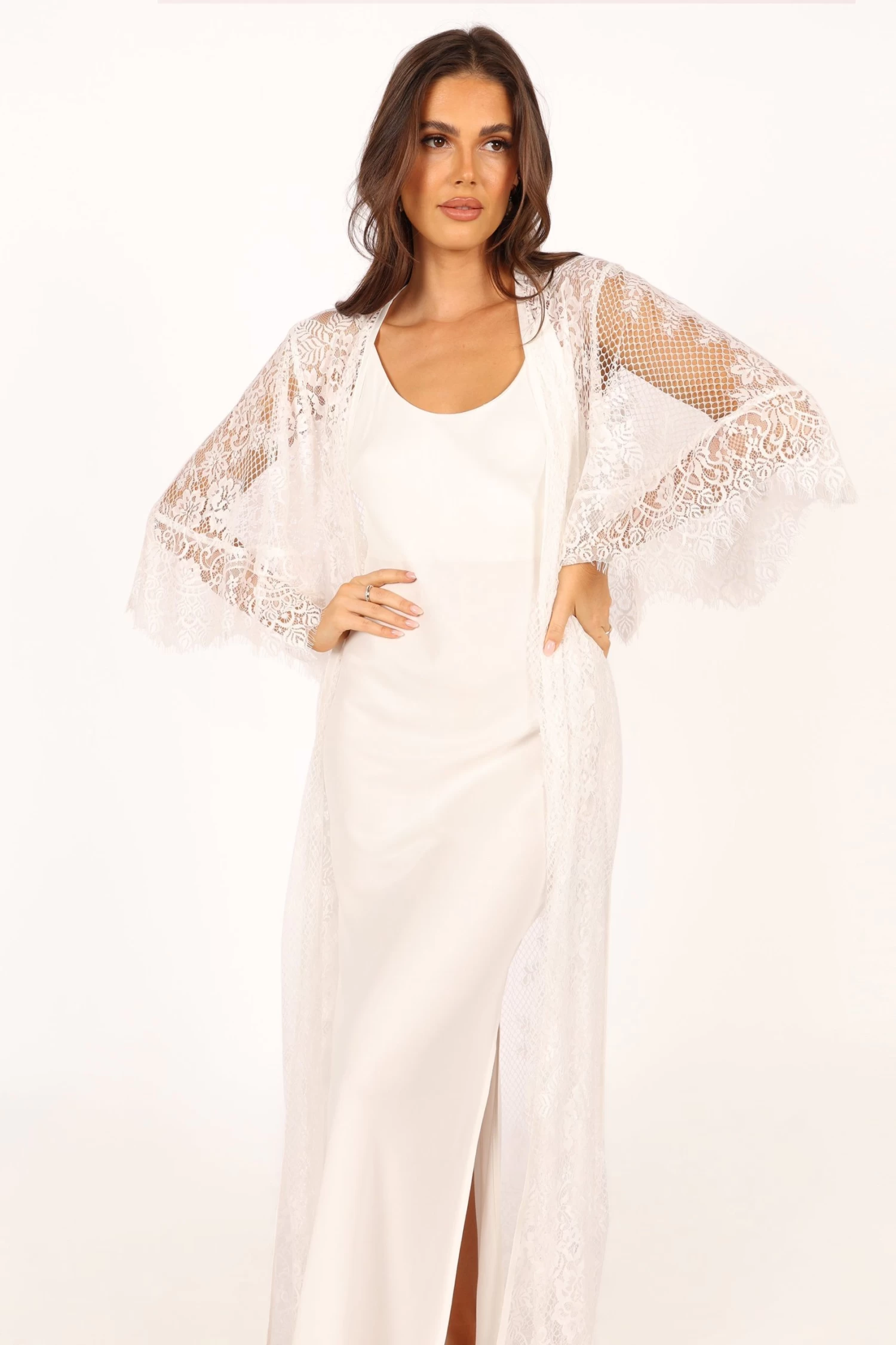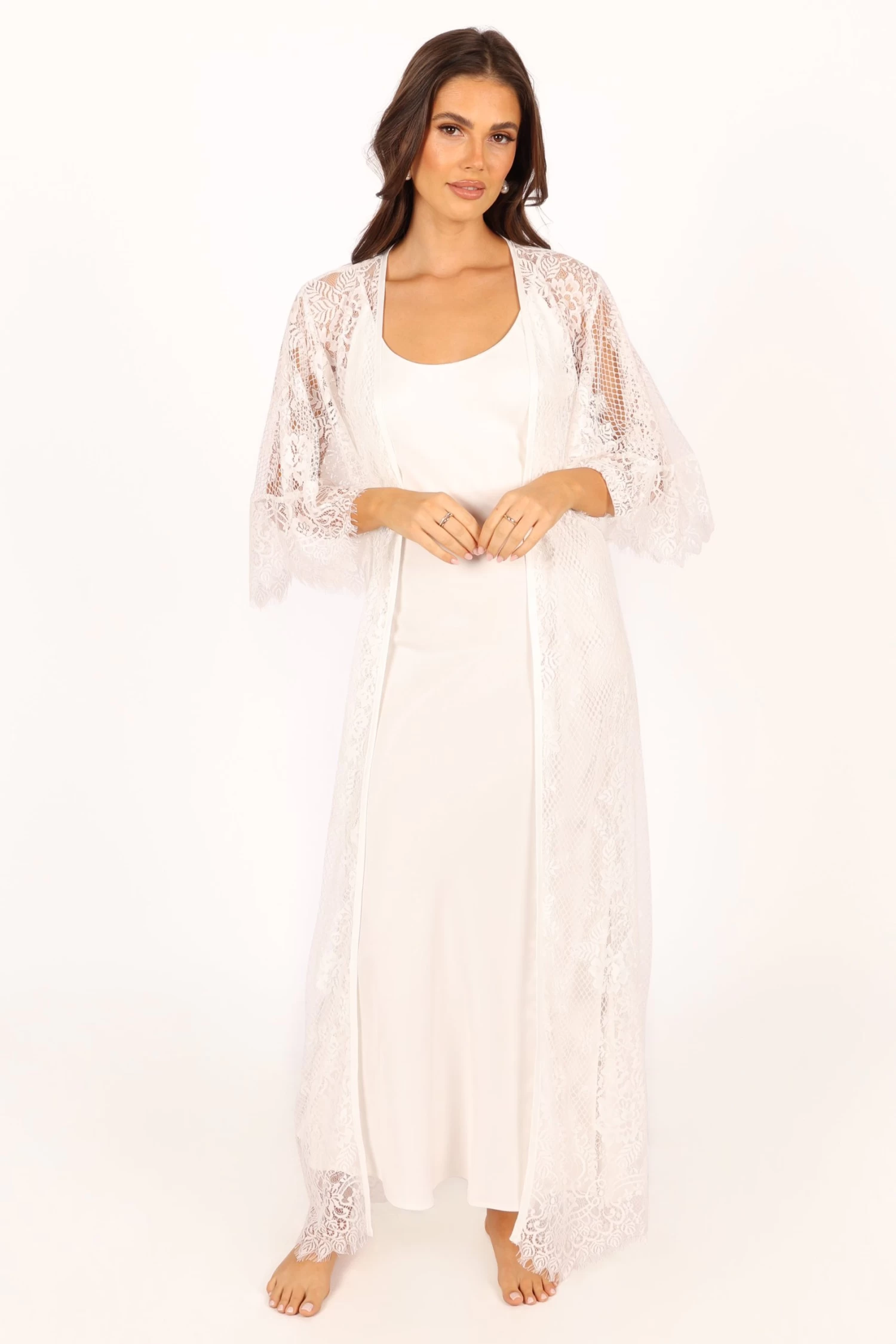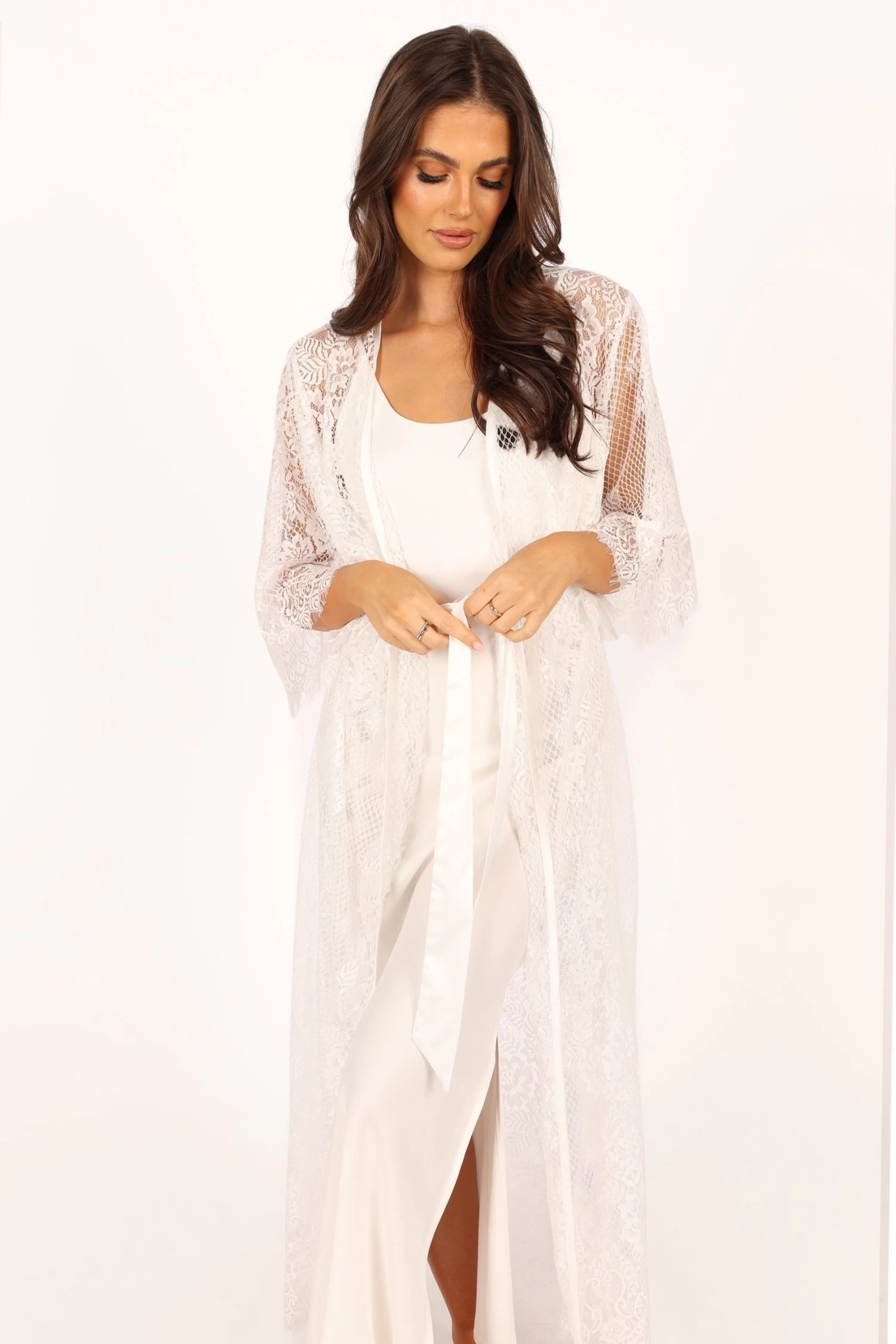 | DETAILS This soft floral lace robe is the perfect addition to your lingerie wardrobe. With a long length style and relaxed sleeves, it’s perfect for those romantic nights in or out on the town. The wrap front design of this luxurious robe ensures a flattering fit, while the detachable waist tie provides extra security and comfort.