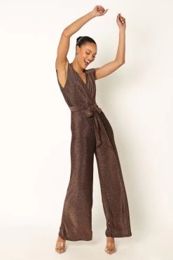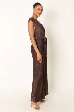 | DETAILS Introducing the perfect party jumpsuit! This beautiful sleeveless design is crafted from a luxurious chocolate metallic material, and features an overlay neckline with hook and eye clasp. Additionally, a back v detail adds to its chic style. The wide leg silhouette is complemented by an elasticised waistband and detachable waist tie for extra comfort and versatility.