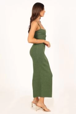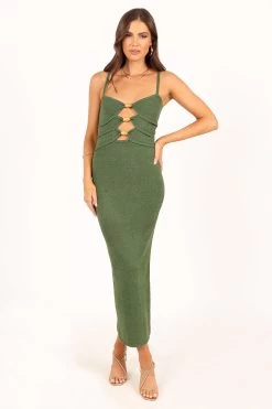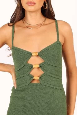 | DETAILS Take your look to the next level with this stunning midi knit dress! Featuring a v neckline and thin adjustable straps, it’s sure to flatter any body shape. The highlight of this piece is the unique front cut out feature, adorned with pretty wood bead detail for an extra dose of femininity!