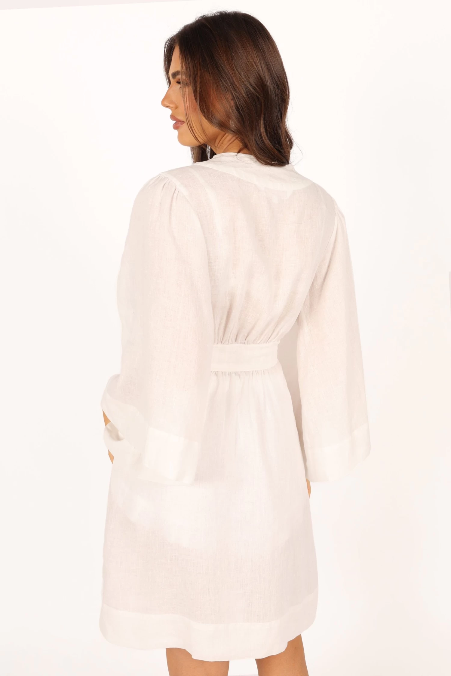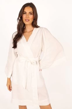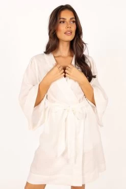 | DETAILS This linen style robe is perfect for getting cozy and comfortable. It features long sleeves with a relaxed fit and flared cuffs that are sure to keep you warm. Plus, the attached linen belt allows you to easily customise the look and make it your own.