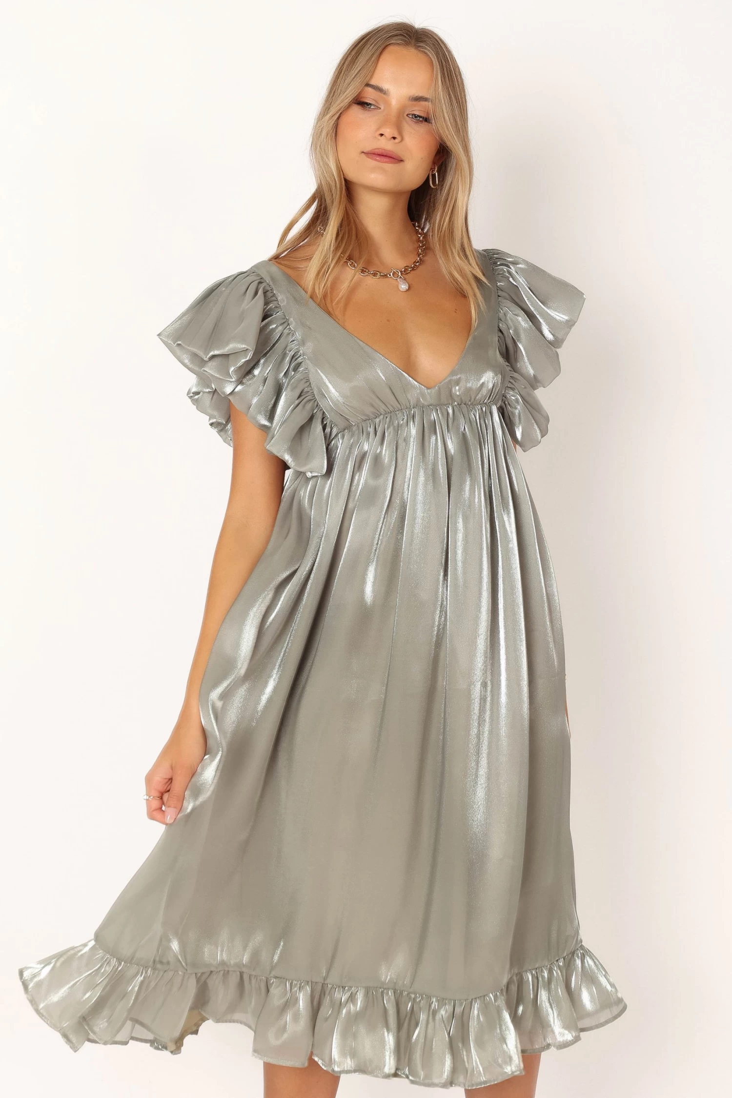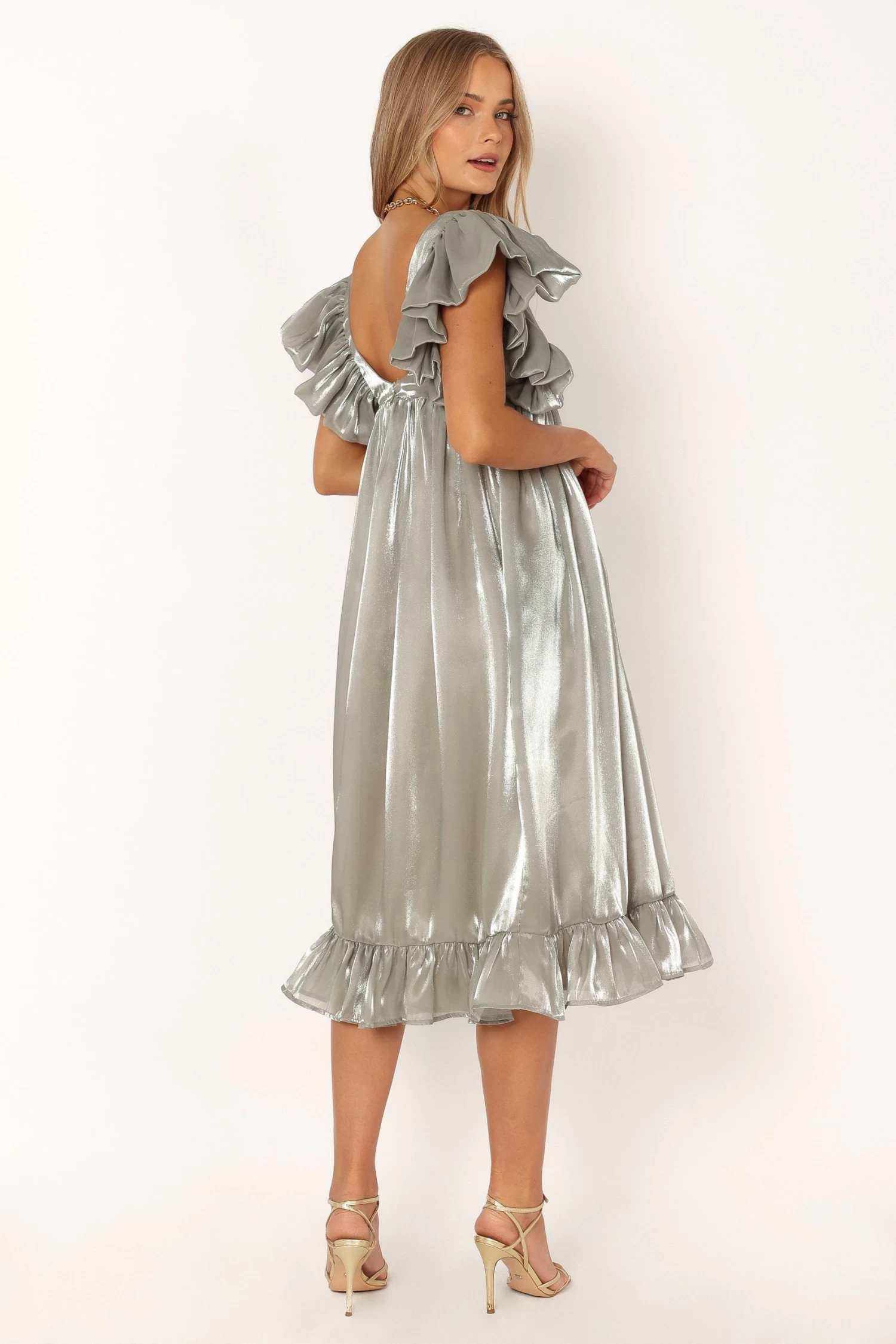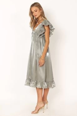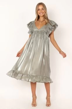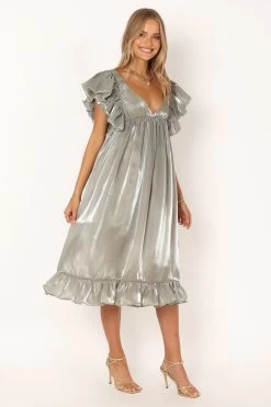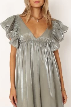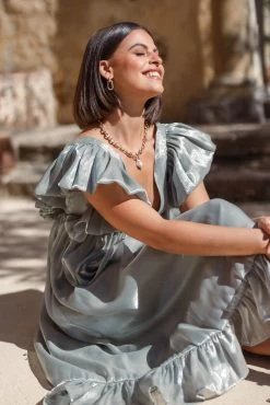 | DETAILS Introducing the perfect piece for any special occasion! This maxi dress is made from a luxurious satin sheen material and features an elegant V-neckline, short ruffle sleeves, and a ruffle hem. The back has an invisible zip fastening with hook and eye clasp, as well as a subtle back split that makes it the ideal eventwear.
