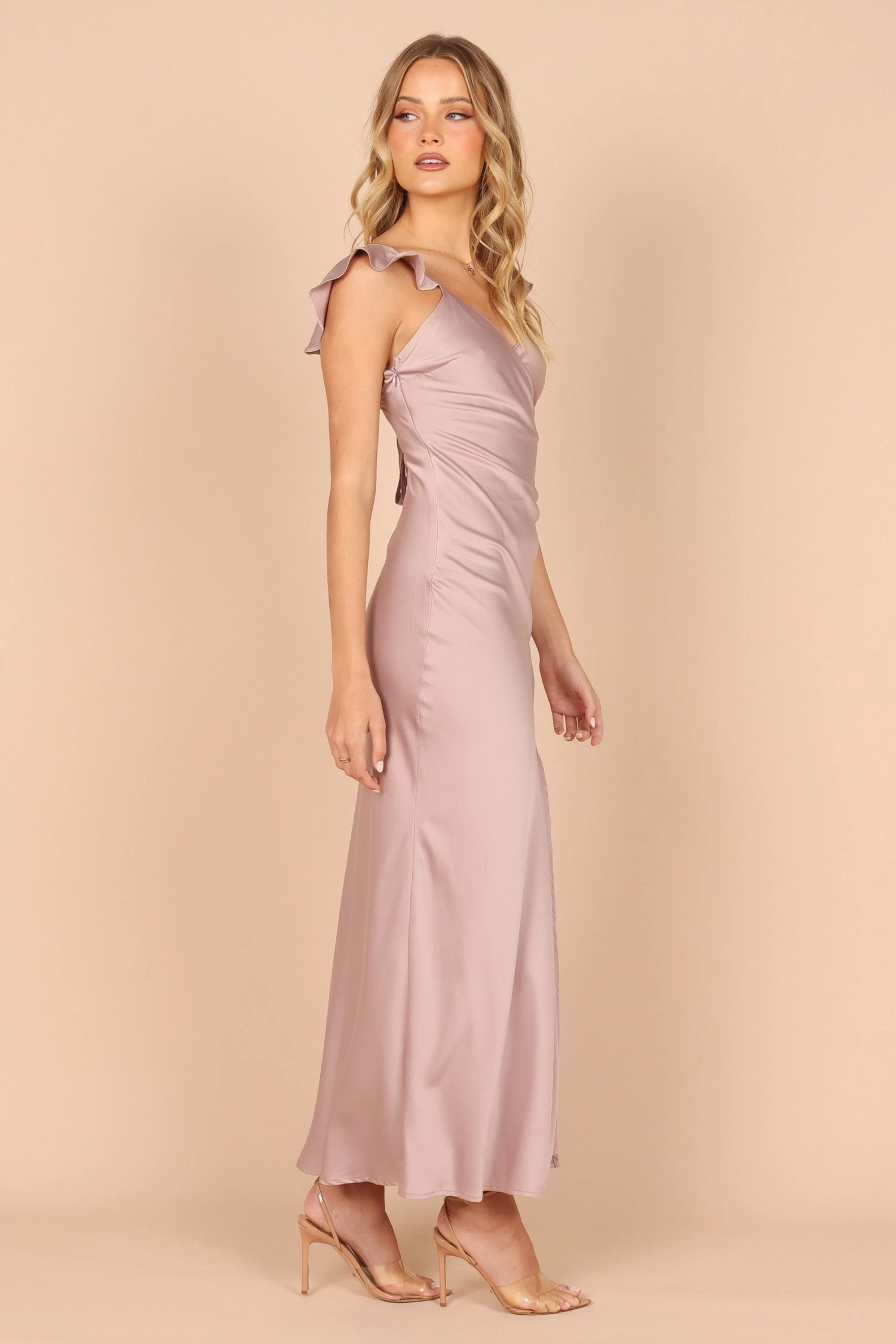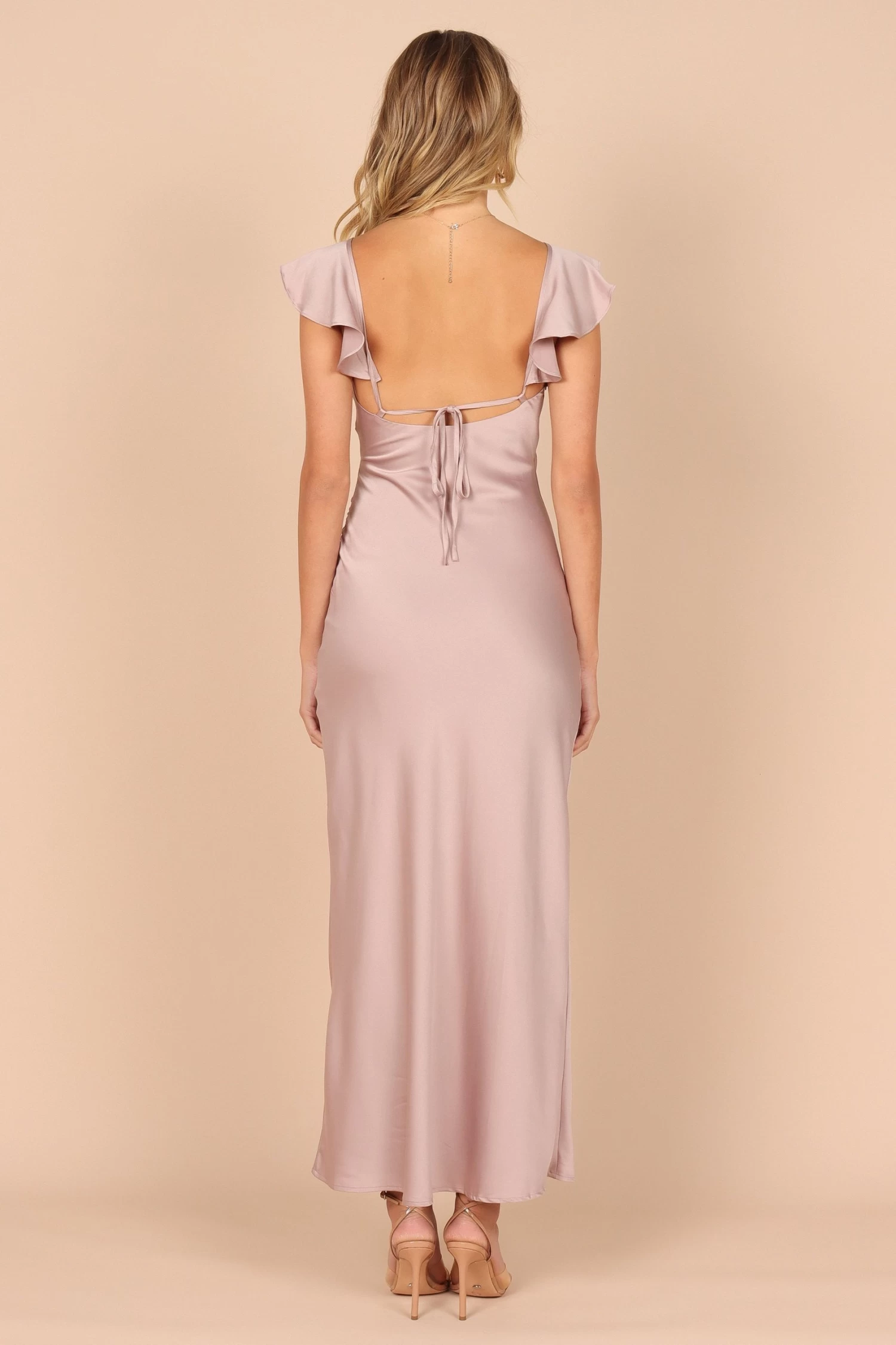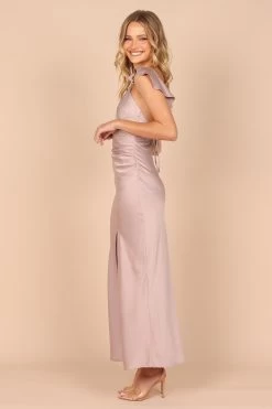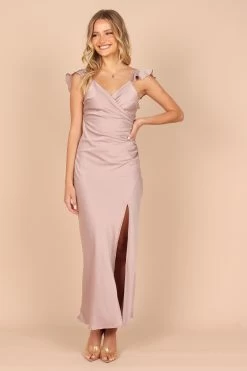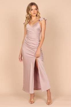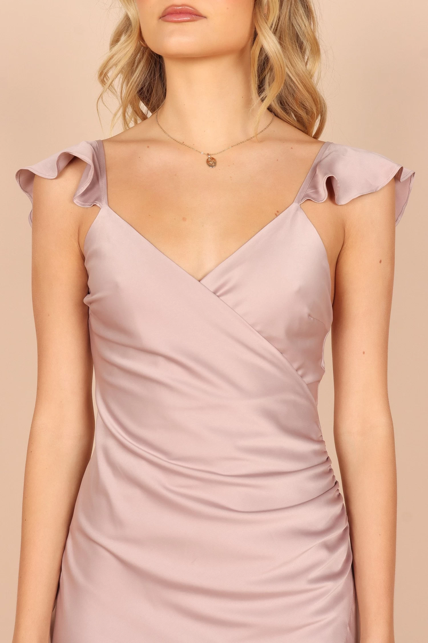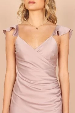 | DETAILS Be the belle of the ball in this gorgeous maxi length dress! With an overlay neckline and ruching detail, this frock is perfect for a formal occasion. Thin tie close straps with frill cap sleeves offer a hint of elegance, while a front high split feature brings some fun to your look.