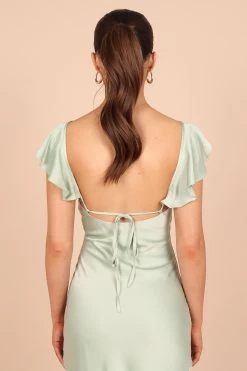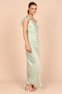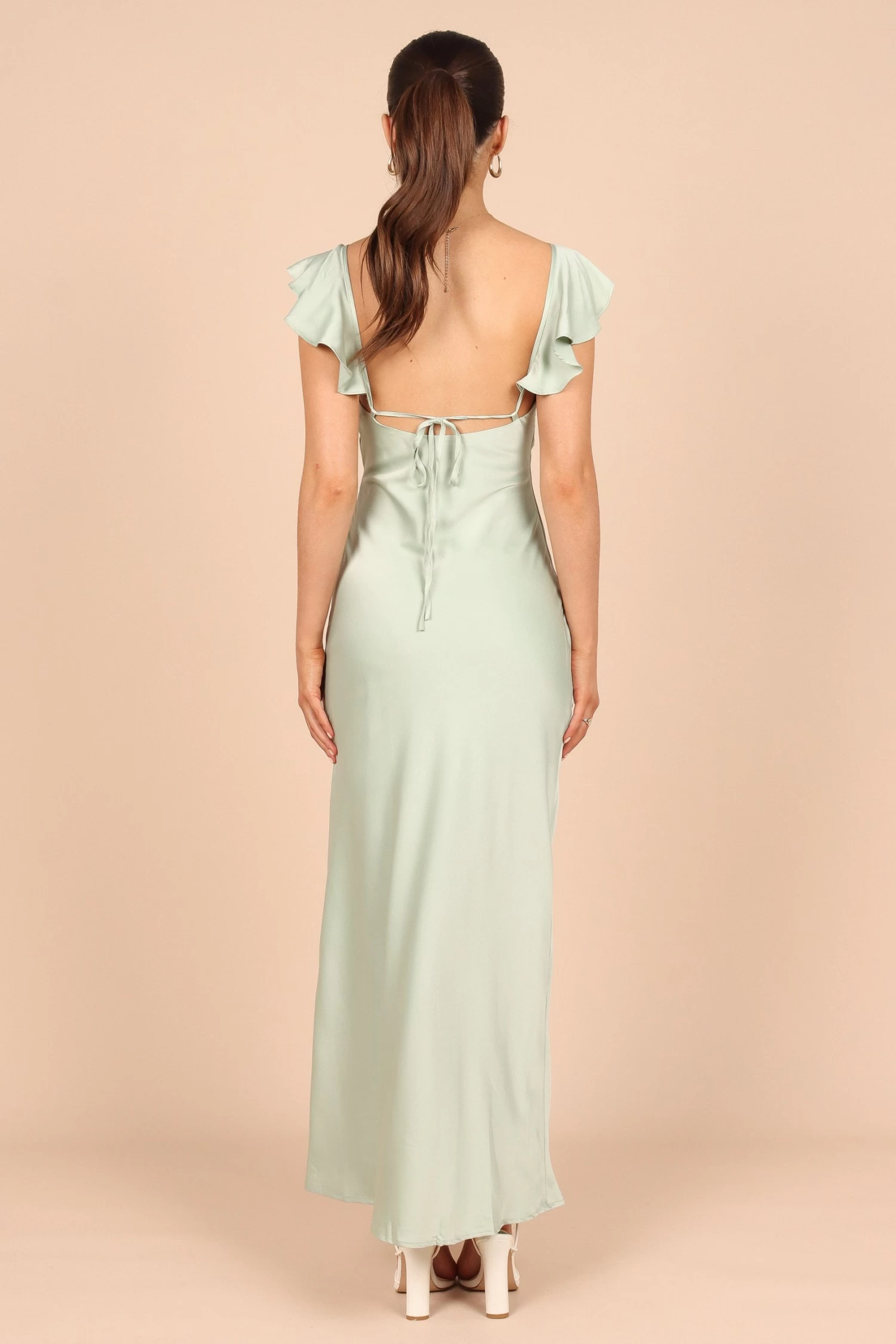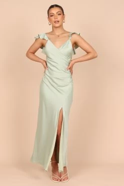 | DETAILS Be the belle of the ball in this gorgeous maxi length dress! With an overlay neckline and ruching detail, this frock is perfect for a formal occasion. Thin tie close straps with frill cap sleeves offer a hint of elegance, while a front high split feature brings some fun to your look.