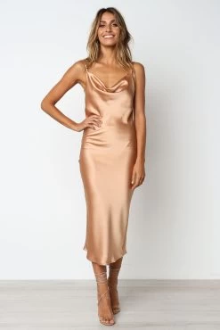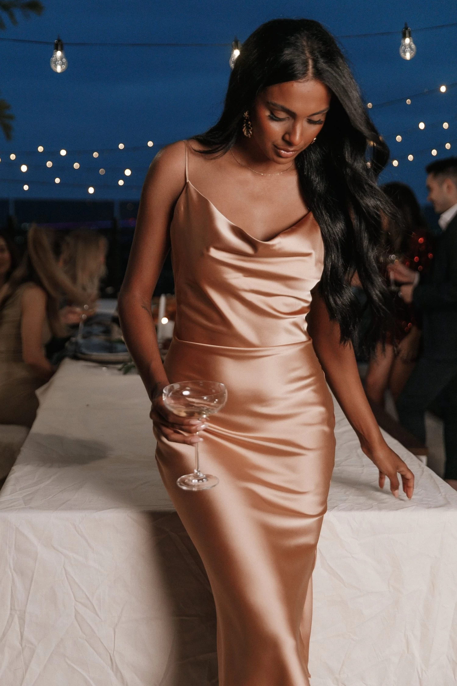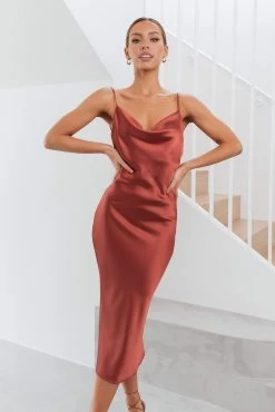 | DETAILS This midi-length cowl neck dress is the perfect blend of style and sophistication. Its thin adjustable shoulder straps give you the perfect fit, while its back split adds a flirty touch to your look. The silky satin finish will ensure that you sparkle all night long!