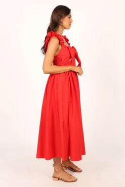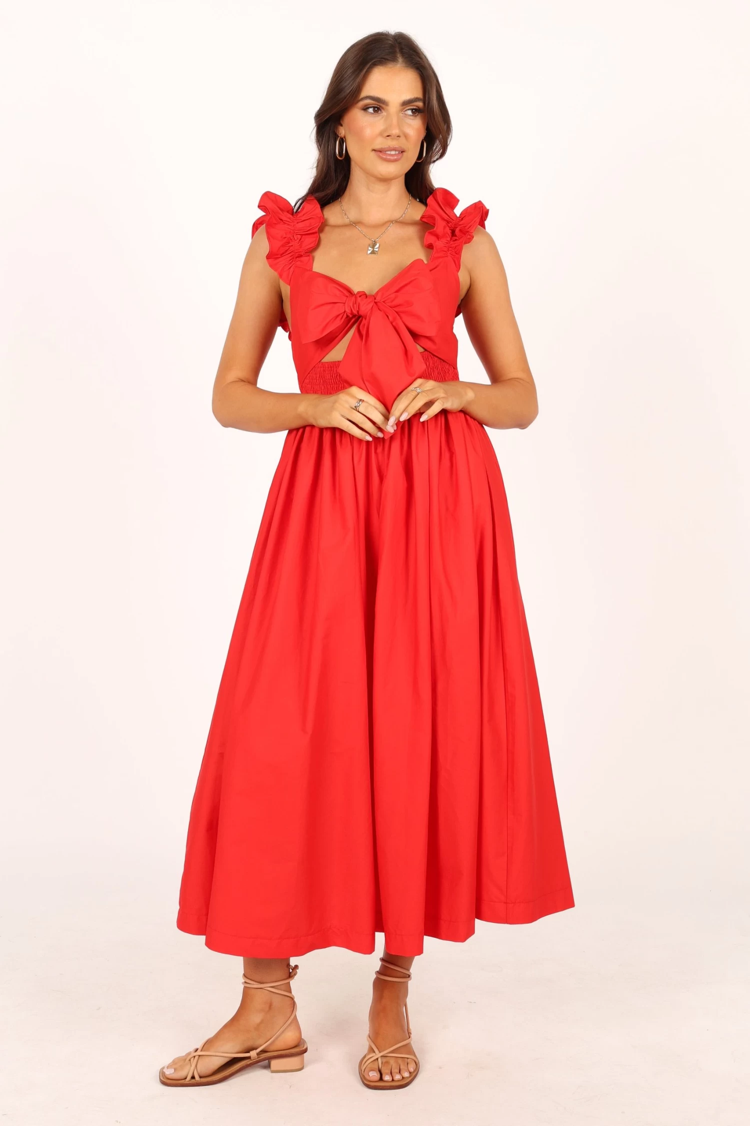 | DETAILS This beautiful red midi dress is here to make you look and feel fabulous! Featuring an elegant sweetheart neckline, elasticised straps with a ruffle detail, and an attached front tie bust feature, this dress is full of feminine charm.