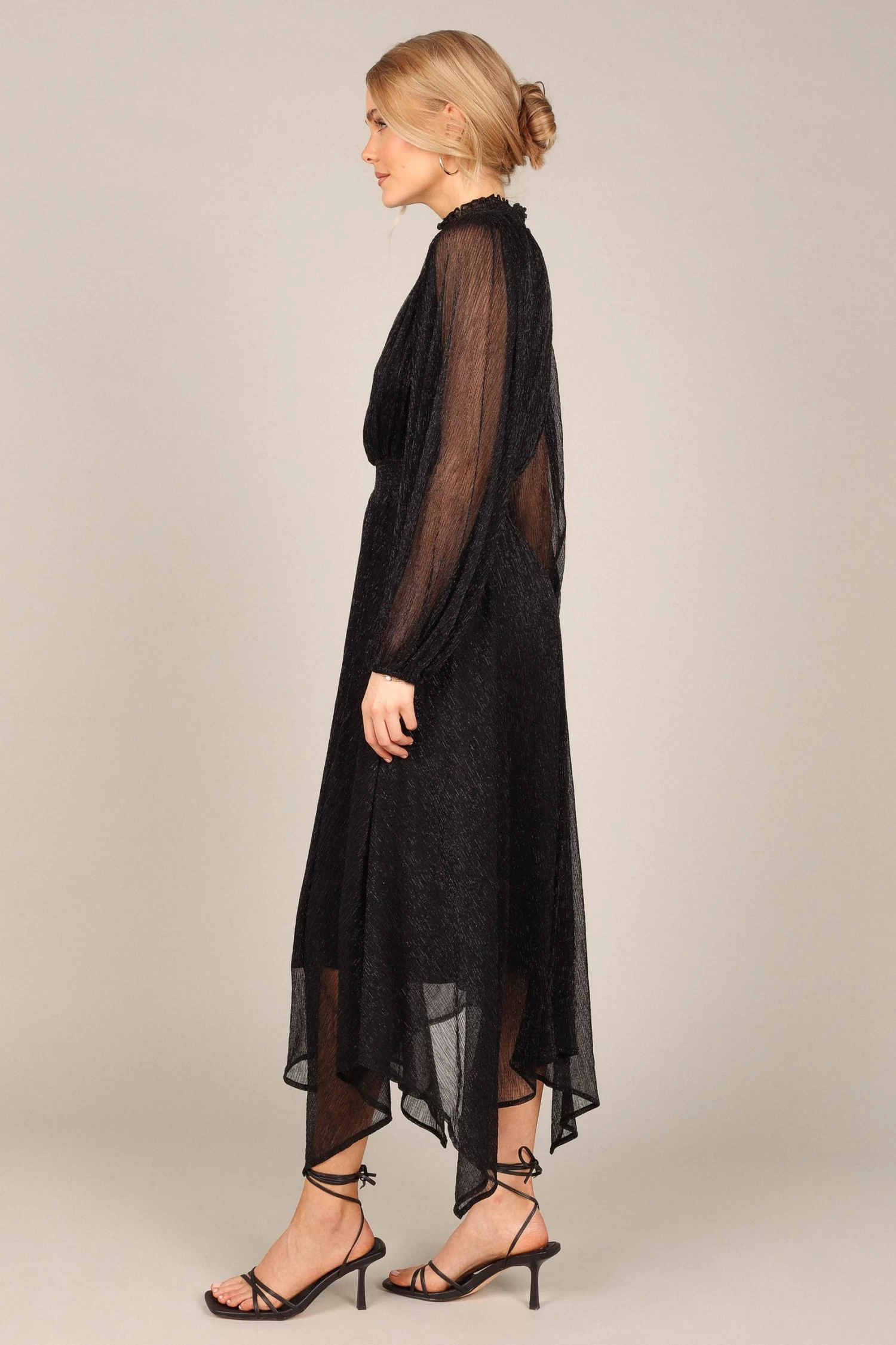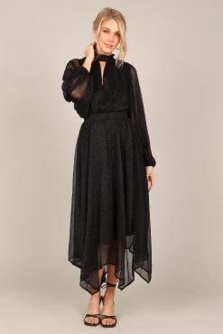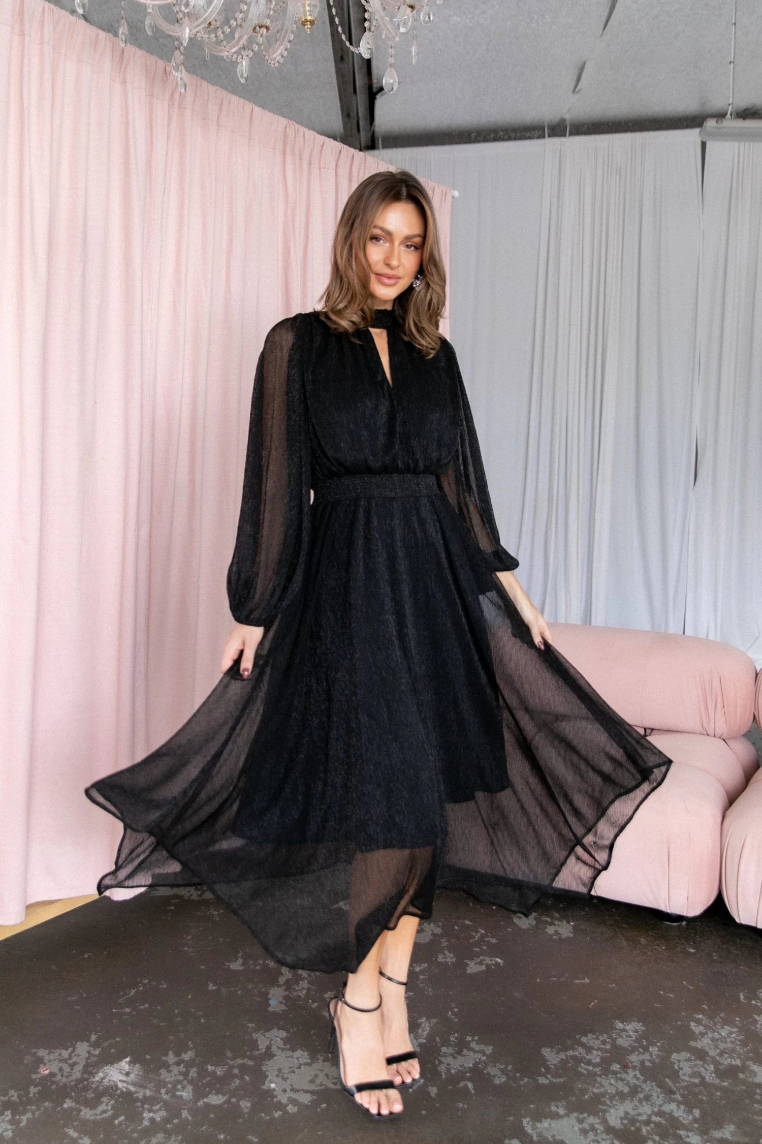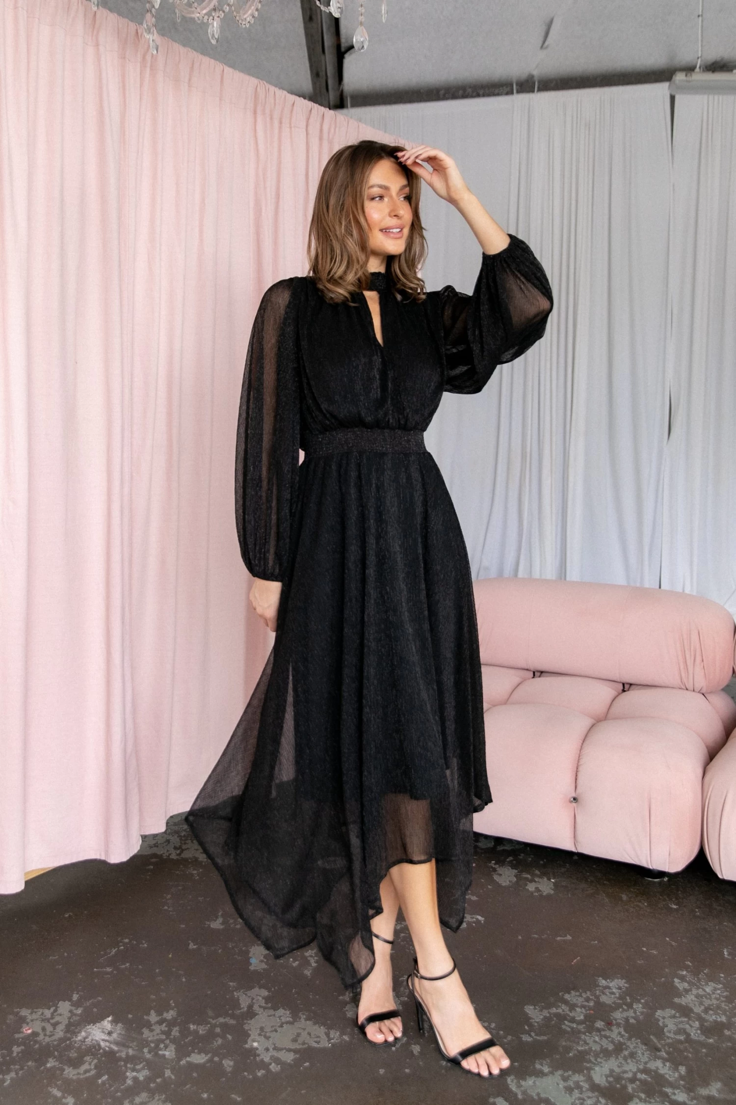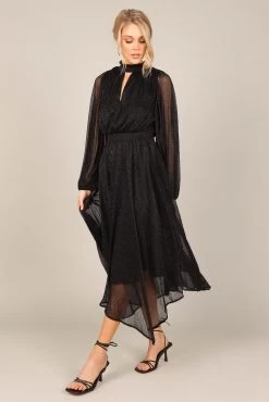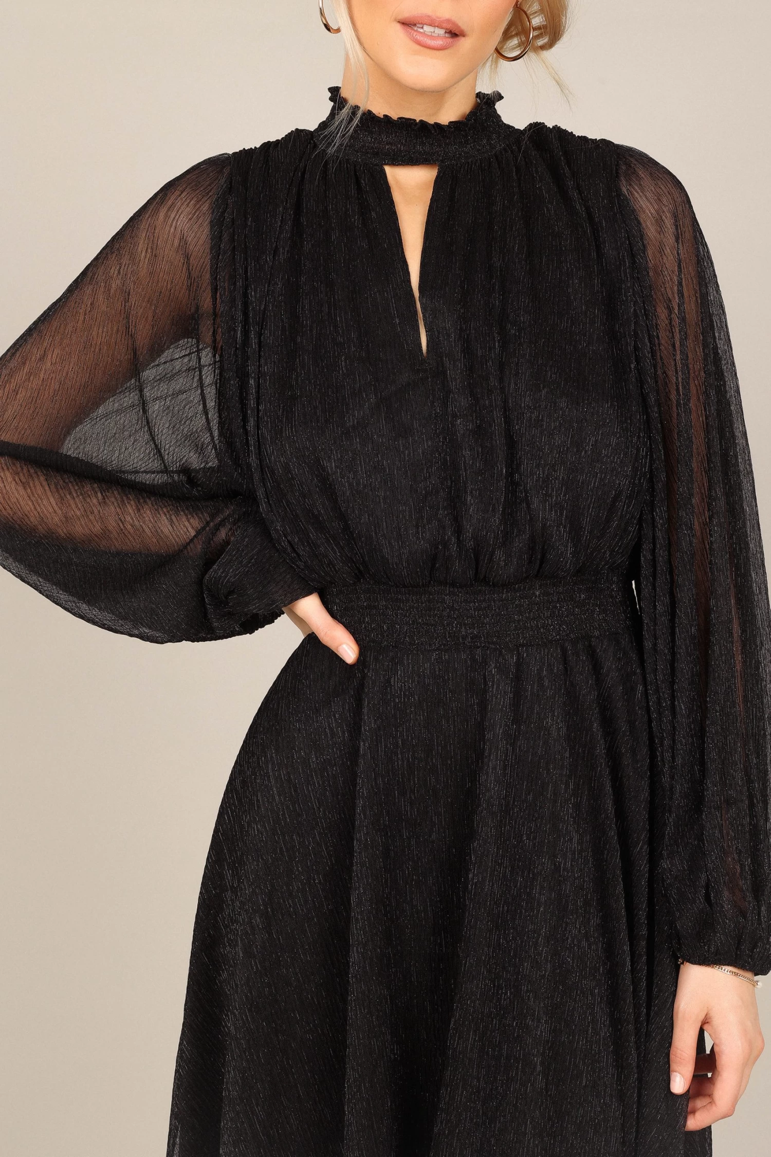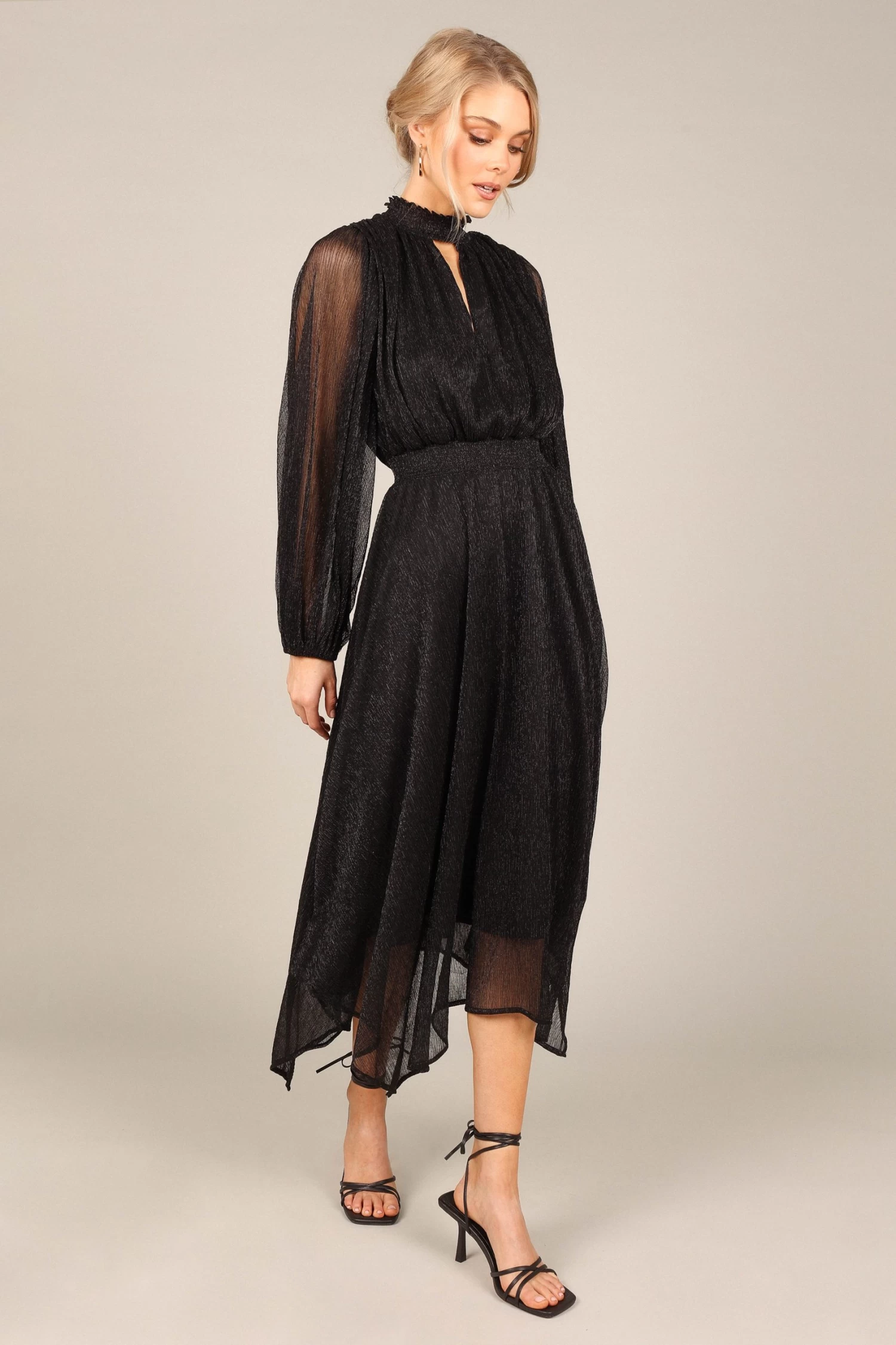 | DETAILS This midi dress is the perfect wardrobe staple for any party. With a classic high round shirred neckline, long sleeves with elasticised cuffs, and an eye-catching front cut out on the bust, this midi length dress will have you looking effortlessly stylish at every event.