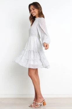 | DETAILS This above-knee length dress is sure to make heads turn! Featuring a high neckline with ruffle detail, a shirred bodice and long sleeves with elasticated cuffs, it’s an effortlessly flattering silhouette.