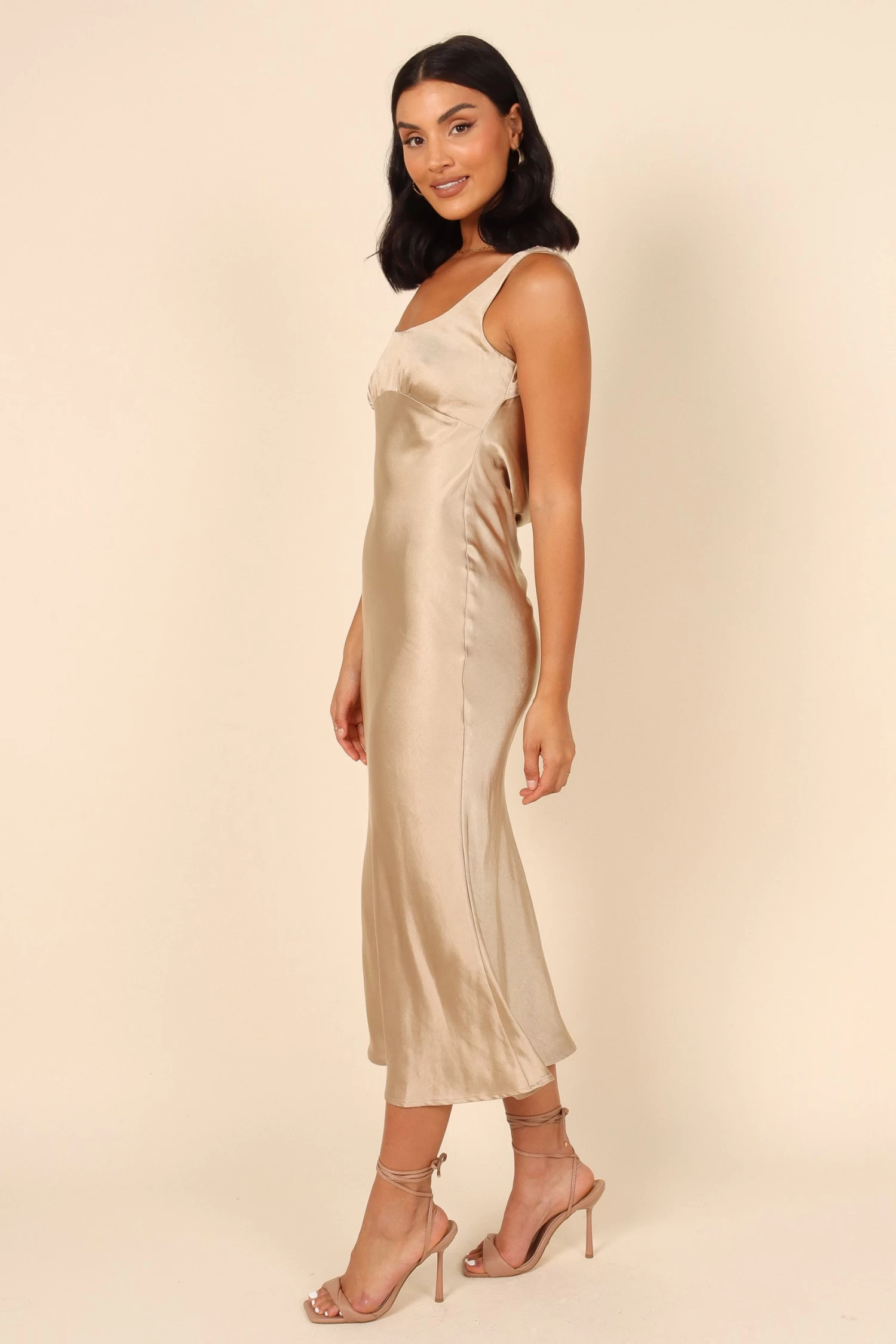 | DETAILS The perfect party dress is here! Look no further than this chic midi-length number that has all the bells and whistles you need. Featuring a round neckline with non-adjustable straps and a back neck opening with tie close detail, it shows off just the right amount of skin while giving you enough coverage too.