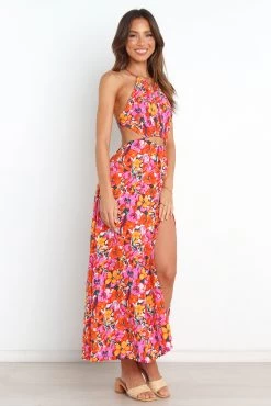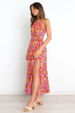| DETAILS The Senorita Dress will turn heads with the vibrant floral print and flattering silhouette. The maxi length will elevate your look while the halter neckline, waist detail and leg split add a touch of stylish femininity. The open back is eye catching and unique so you will be feeling like your most elegant self!