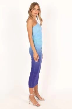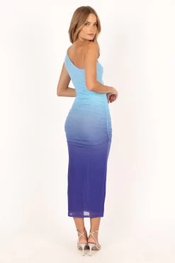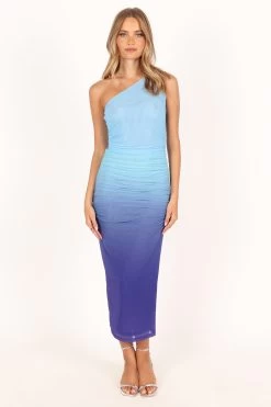 | DETAILS This season upgrade your evening wear with this stunning one shoulder midi dress. Featuring a beautiful gradient blue design, the classic silhouette is complemented by gathered ruching detail to flatter any figure.