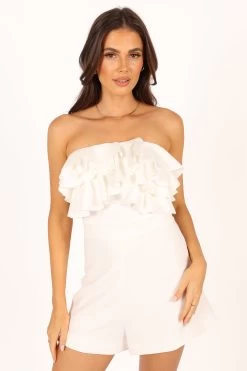 | DETAILS The strapless style romper features a beautiful ruffle bust detail that adds a touch of femininity and elegance to the outfit, making it a perfect choice for parties and special occasions. The garment is designed with an invisible back zip, ensuring a seamless fit and a sleek silhouette.