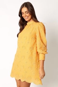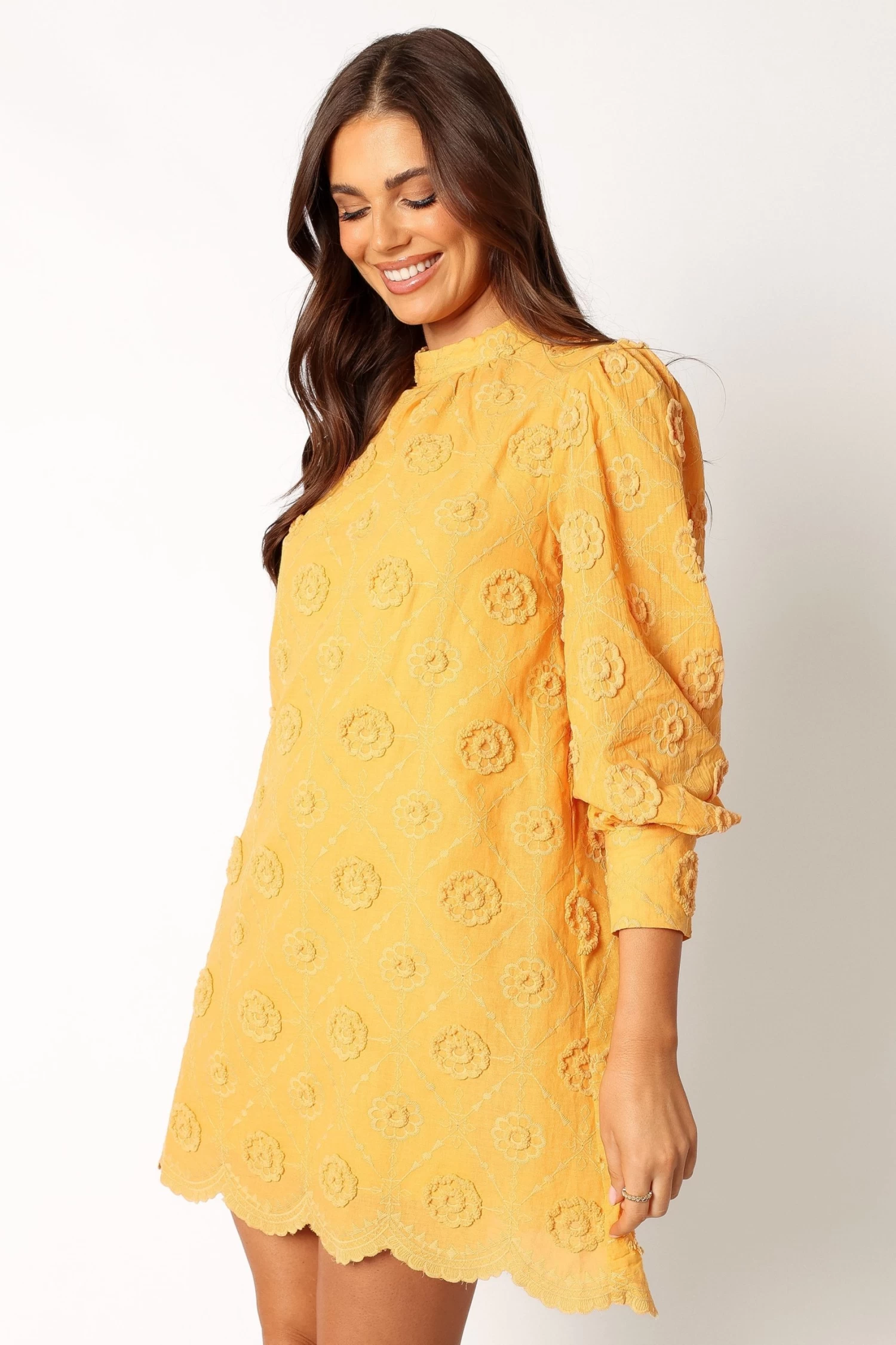 | DETAILS This high neck mini dress is sure to be your wardrobe’s new darling, with its romantic floral embroidery! The back button closure and above-knee length make it comfortable and fashionable. And the long sleeves with their sweet button cuffs add a dose of charm.