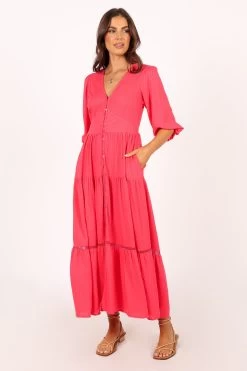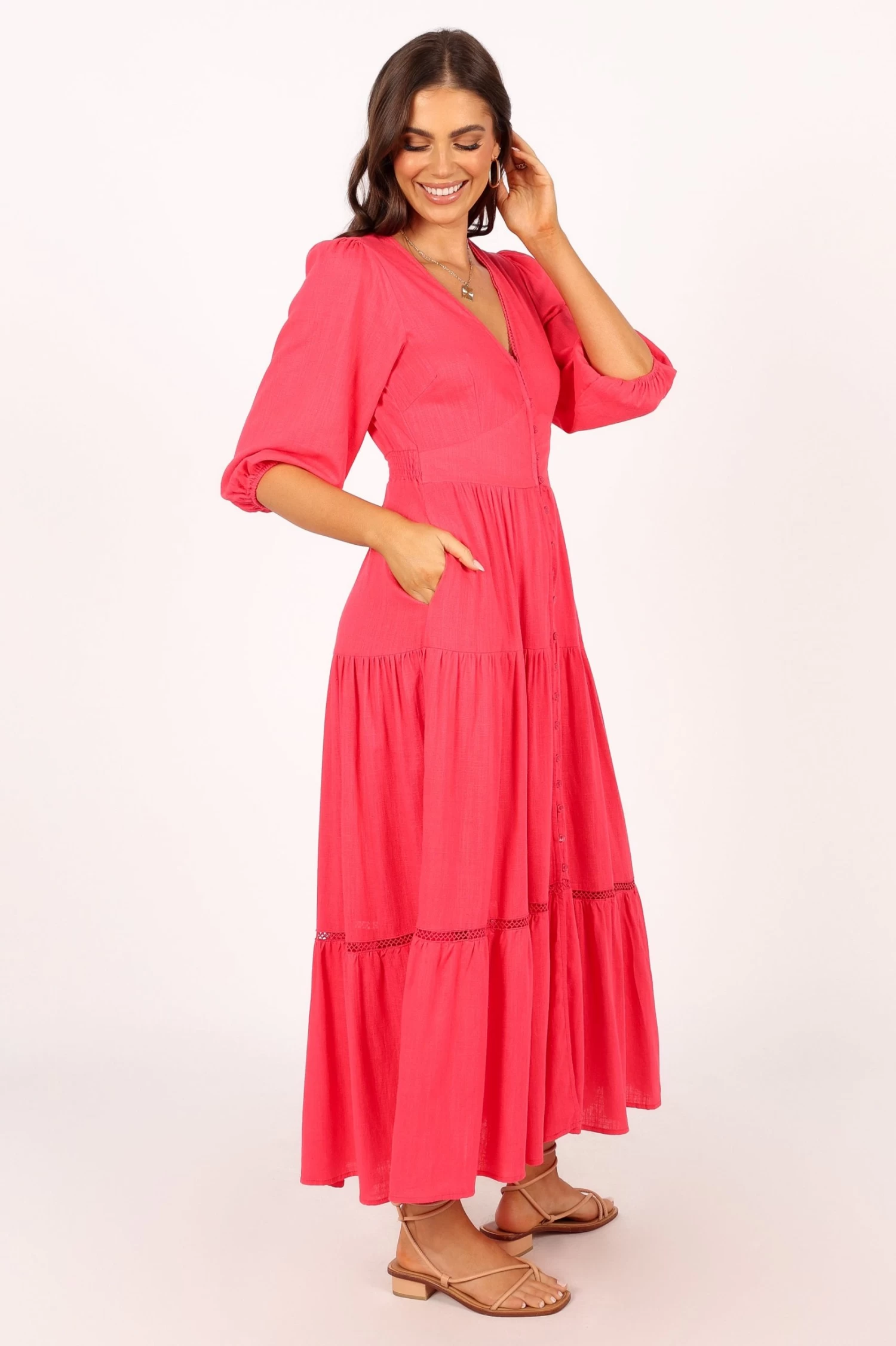 | DETAILS Make an entrance this summer in our stunning midi dress! Its V-neckline and mid length sleeves make it the perfect combination of comfort and style. The front functional buttons down the front keep you feeling secure, whilst the drop tiered skirt design adds a touch of femininity to your look.