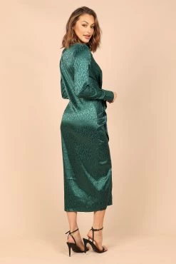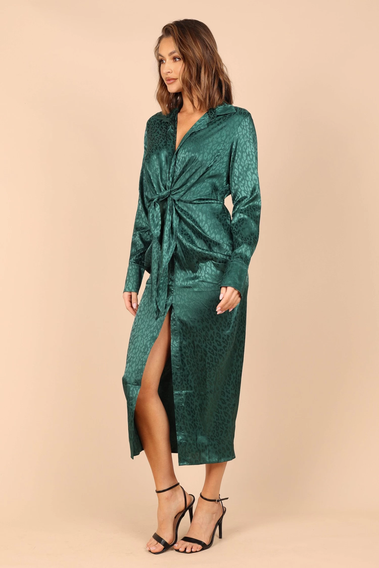 | DETAILS This midi length collared v-neck dress is perfect for any occasion! With its long sleeves with button closure, functional buttons down the front, and an attached waist tie, you can transition from day to night effortlessly.