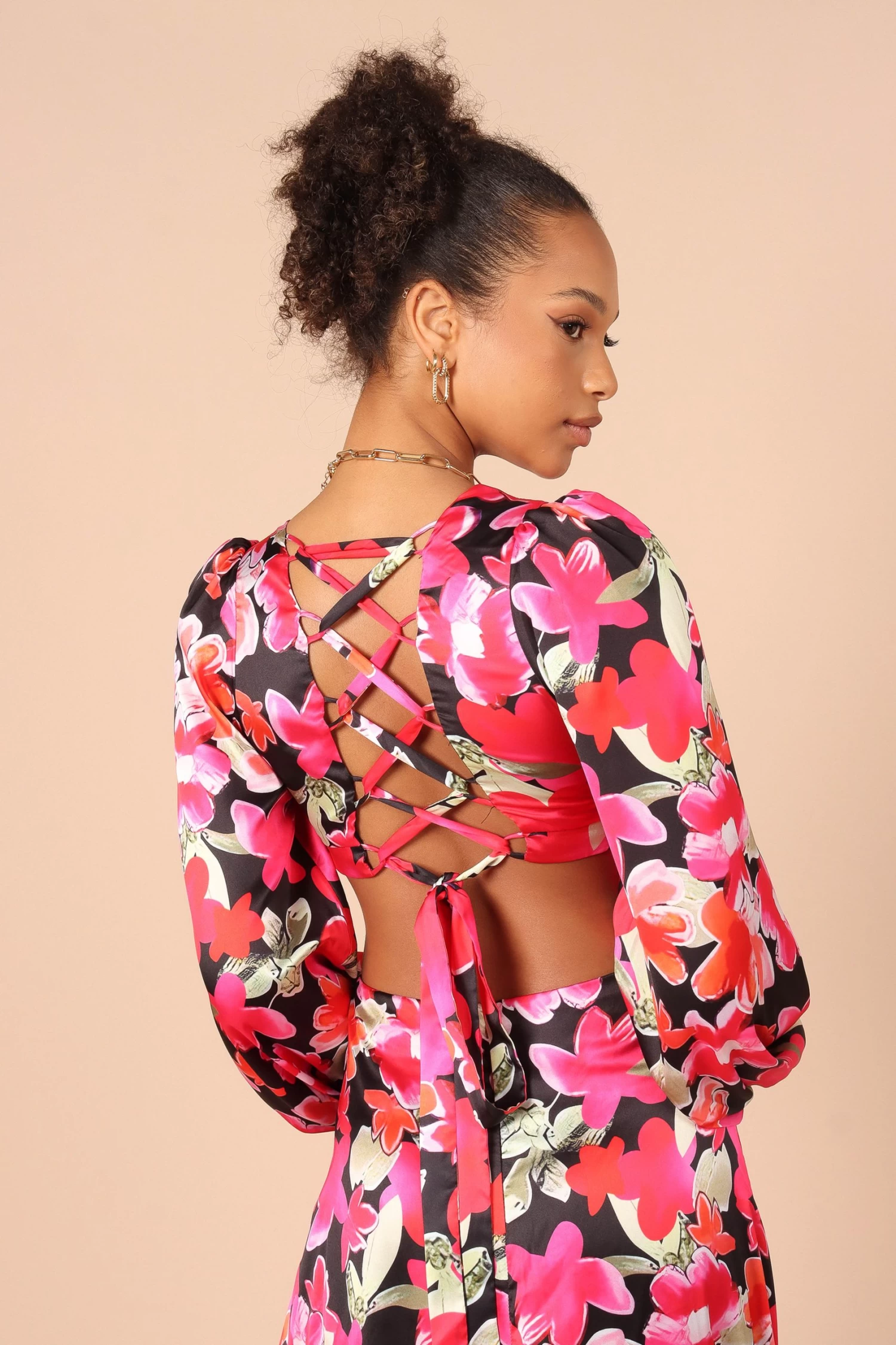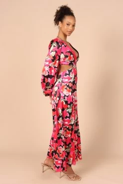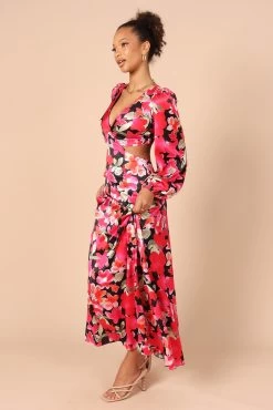 | DETAILS Step into summertime with this floral dress! With a v-neckline and long sleeves, it’s perfect for any special occasion. The elasticised cuffs and side cut out detail add an extra bit of sass to your look, while the back invisible zip and hook and eye clasp keep everything secure.