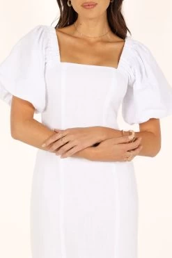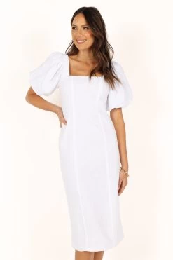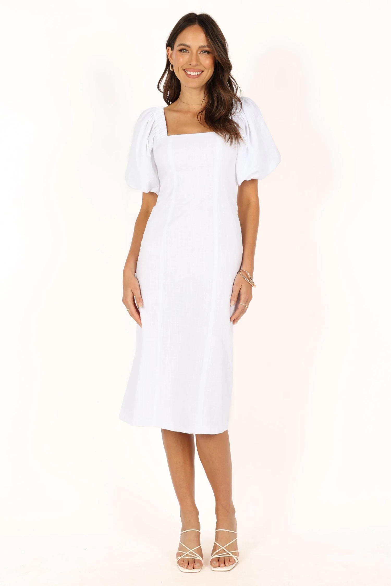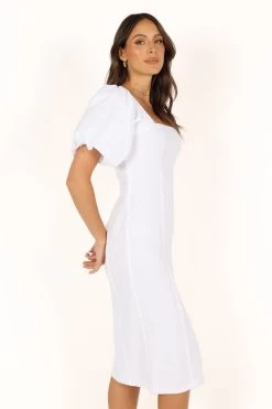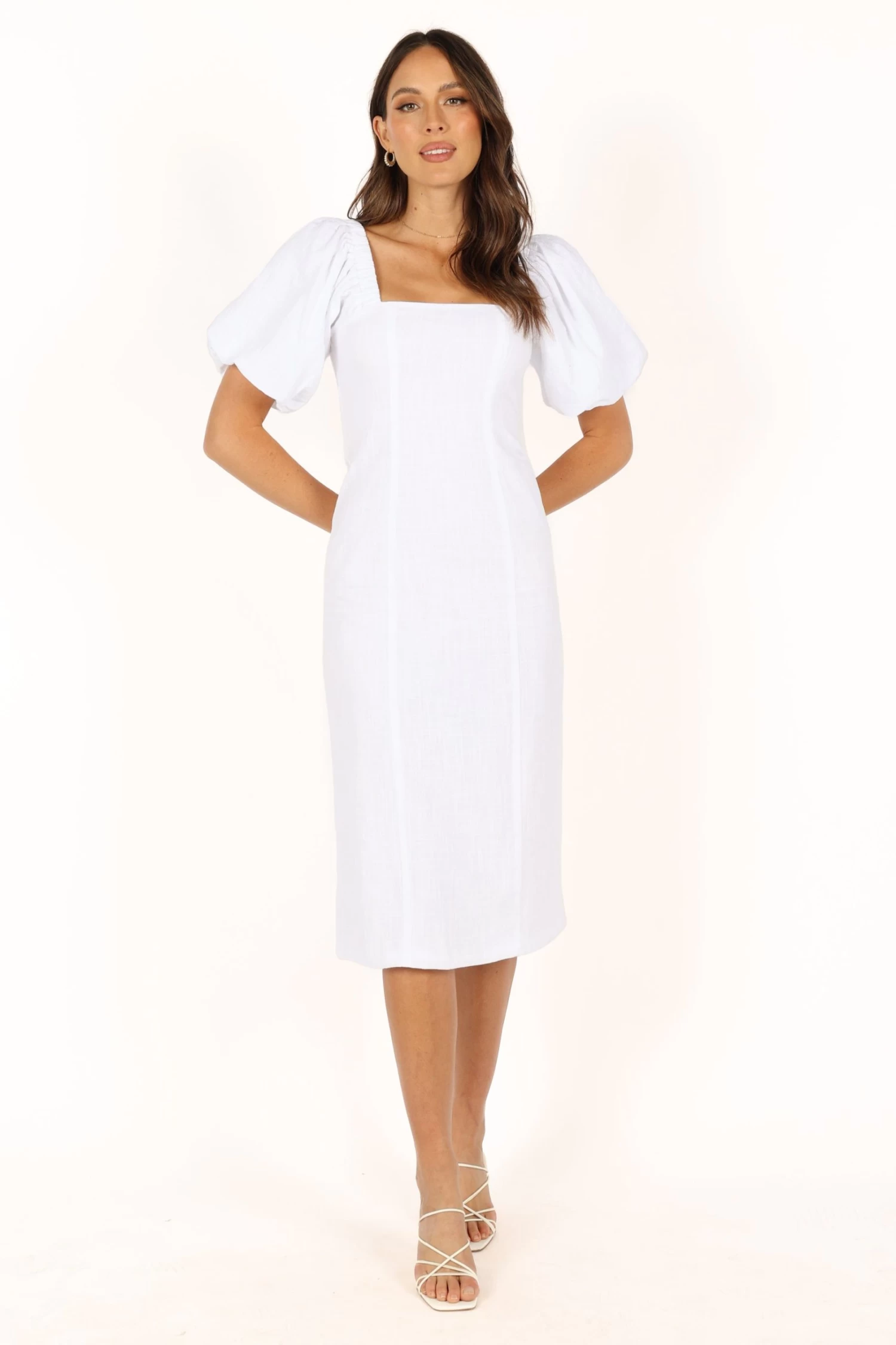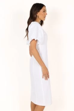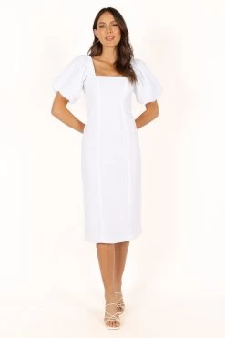 | DETAILS Look lovely in this midi length dress! Featuring a beautiful square neckline, short sleeves with elasticised cuffs for maximum comfort and a back invisible zip for easy wear. Its shirred panel at the back creates an incredibly flattering silhouette that will make you look and feel amazing.