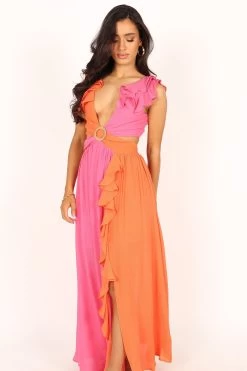 | DETAILS Introducing the must-have maxi dress for summer – the Pink Orange halterneck design with elegant ruffle detail straps. The perfect balance between playful and sophisticated, this dress features a plunging neckline, halterneck tie close, knot feature and cut out design.