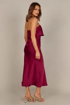 | DETAILS This midi length strapless dress with fold over detail is the perfect event wear for any party. It features an invisible zip with hook and eye clasp at the back, as well as a front split feature that will add a fun, flirty edge to your look. The soft satin feel of this dress will have you feeling extra elegant and ready to take on the night!