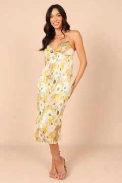 | DETAILS This midi length dress is perfect for any occasion! Featuring a v neckline, thin adjustable straps and a shirred back panel to ensure a comfortable fit. The pleated detailing throughout the dress gives extra movement and style while the floral print adds just the right touch of femininity.