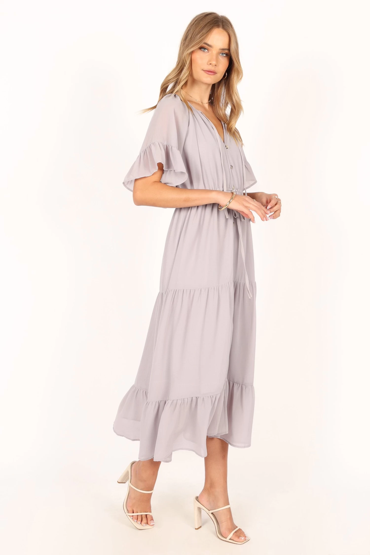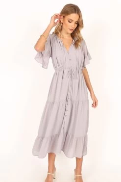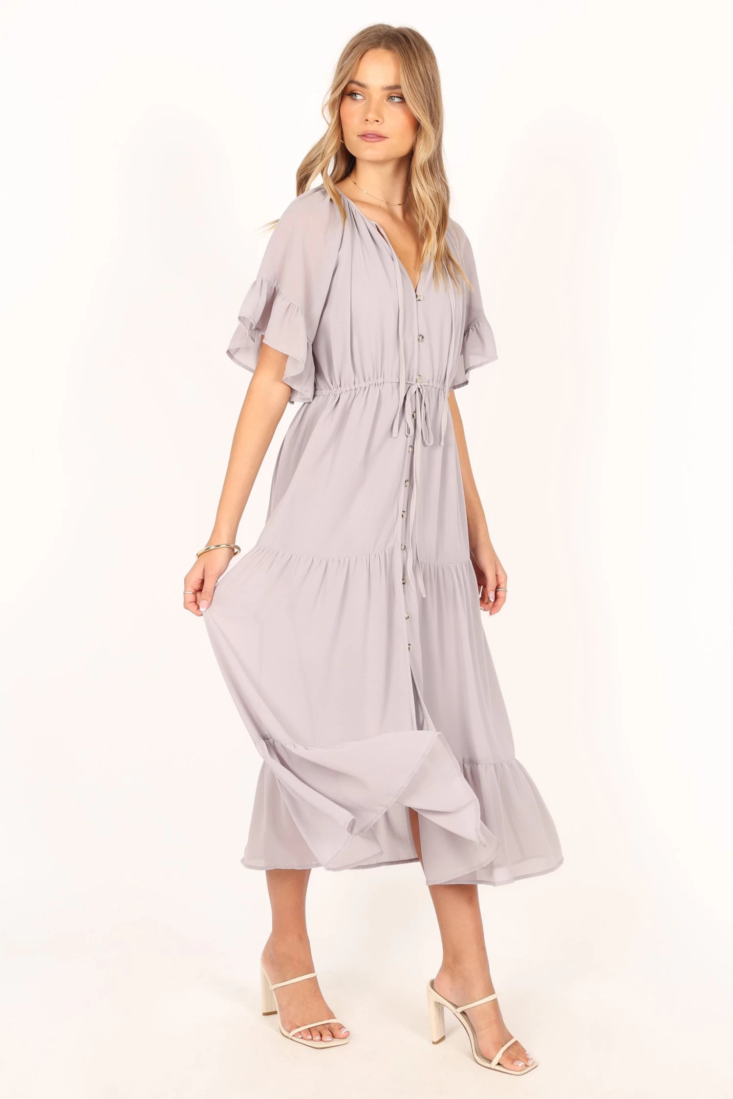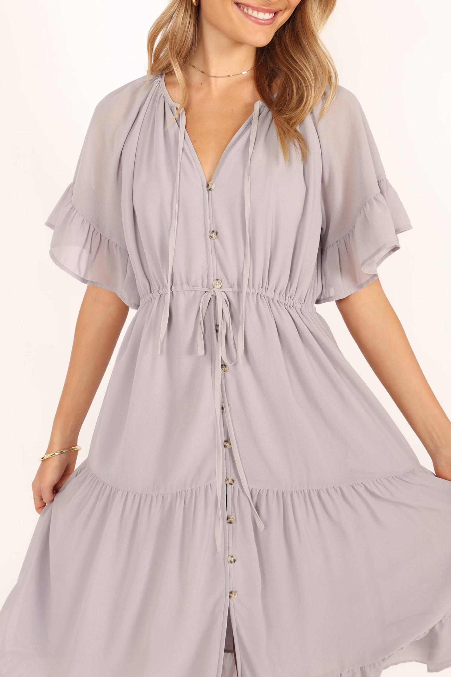 | DETAILS Dress to impress with this beautiful midi dress! Featuring a romantic v neckline with adjustable tie detail, short sleeves with statement ruffle feature and front functional button closure. This easy pull on design is complete with draw string waist closure for a perfect fit.